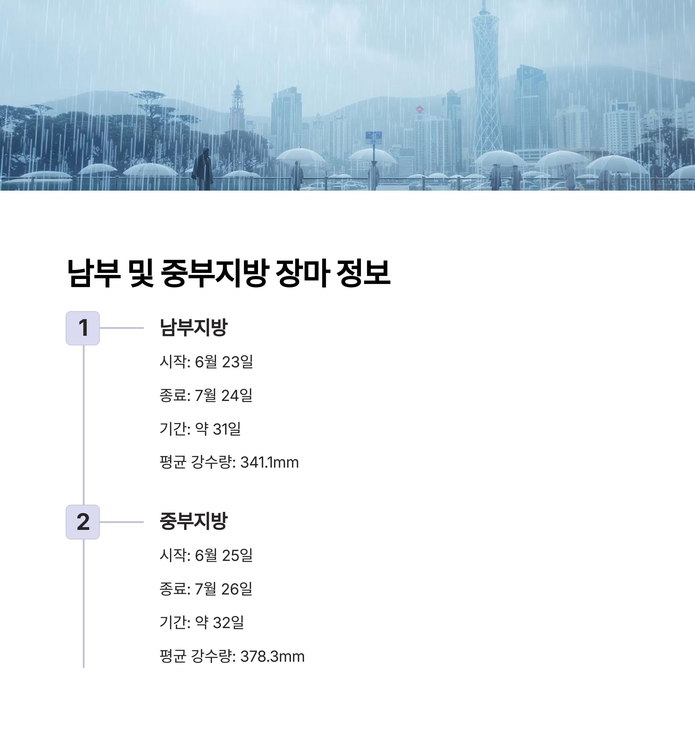 장마철은 매년 찾아오는 자연 현상이지만, 충분한 준비와 올바른 정보를 통해 피해를 최소화할 수 있습니다. 2025년 장마도 슬기롭게 극복하여 건강하고 안전한 여름을 보내시기 바랍니다.