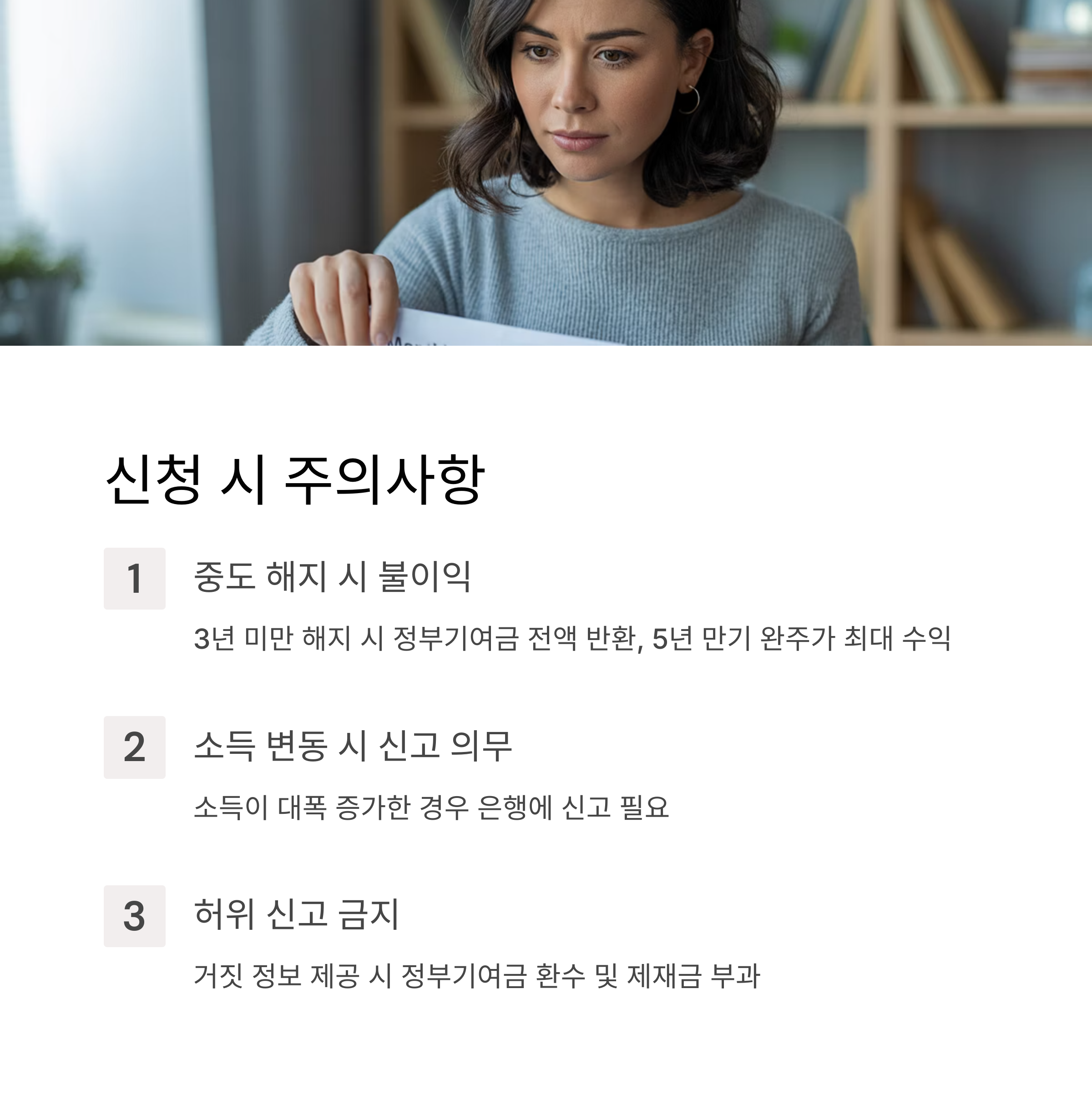 다만 중도 해지 시 불이익이 있으므로 신중하게 판단하여 신청하시기 바랍니다. 특히 3년 미만 해지 시 정부기여금을 모두 반환해야 하므로, 5년간 지속적으로 납입할 수 있는 여건인지 충분히 검토해보세요.