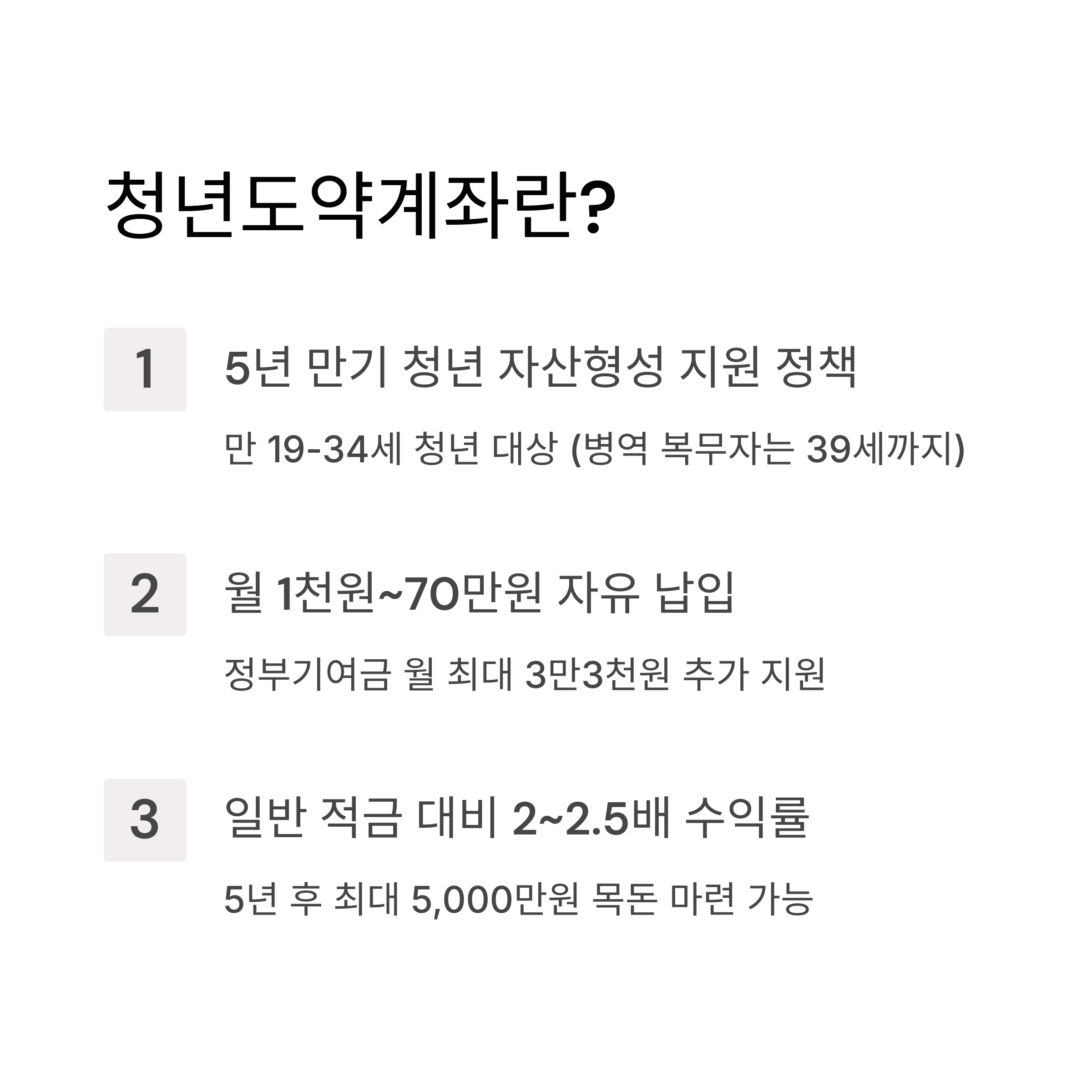 청년도약계좌는 청년들의 자산형성을 위한 정부의 대표적인 지원 정책입니다. 매월 최대 3만 3천원의 정부기여금과 비과세 혜택을 통해 5년간 최대 5,000만원의 목돈을 마련할 수 있는 절호의 기회입니다.