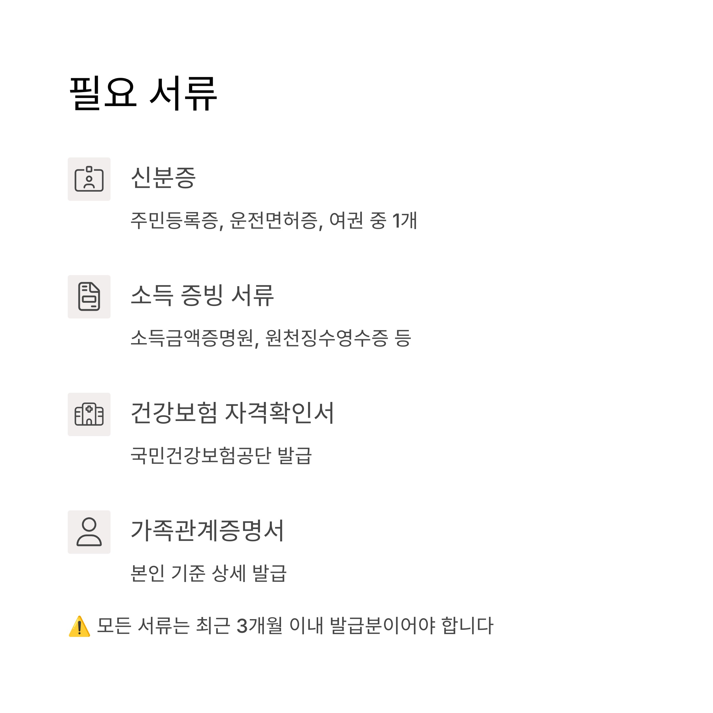 • 소득 증빙 서류는 최신 발급분이어야 합니다.