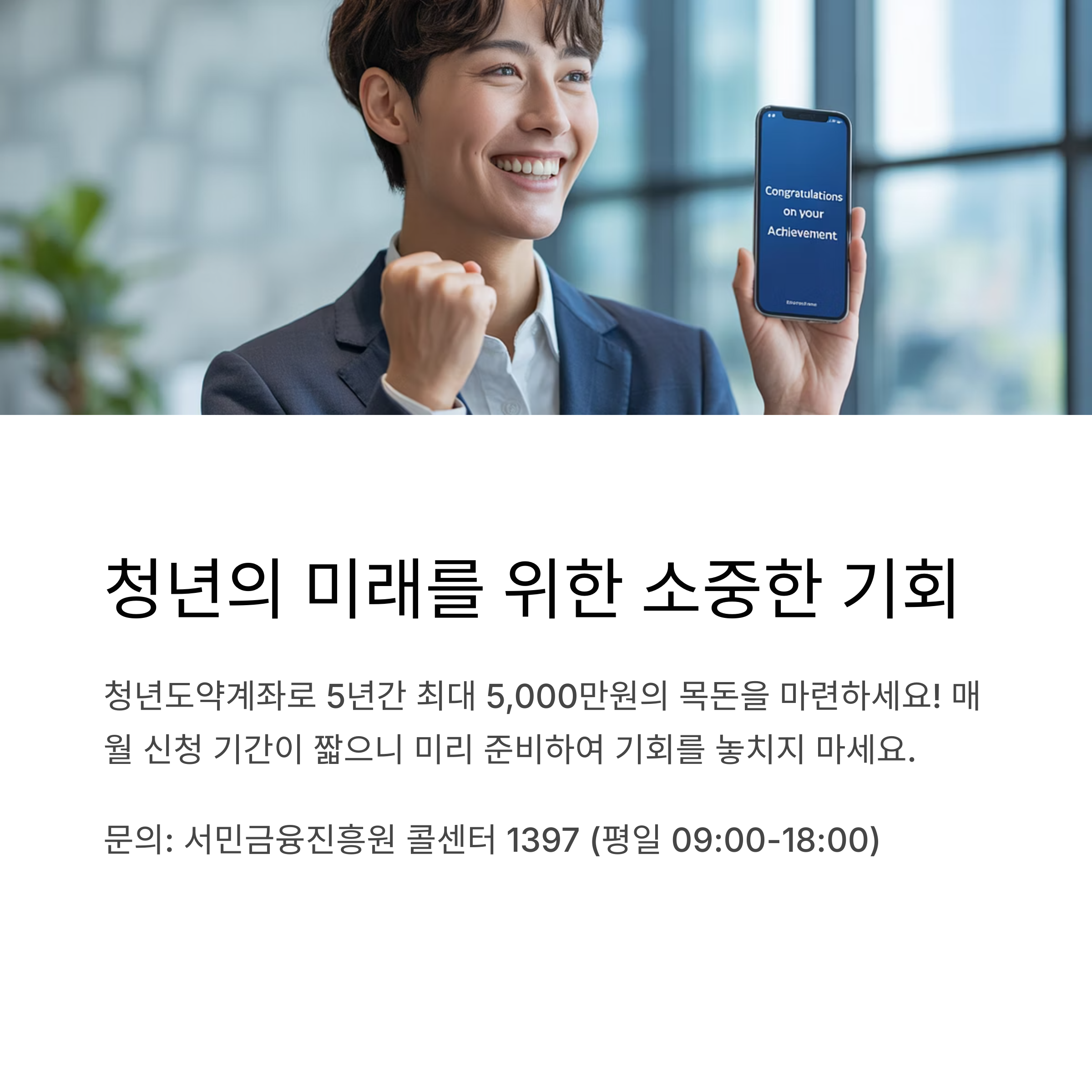 이 상품의 핵심은 정부기여금과 이자소득 비과세 혜택입니다. 5년간 성실히 납입할 경우 최대 약 5,000만원의 목돈을 마련할 수 있어, 일반 적금 대비 2~2.5배의 수익률을 기대할 수 있습니다. 청년들의 주택구입, 창업자금, 결혼자금 등 인생의 중요한 목표 달성을 위한 든든한 밑거름이 될 수 있는 상품입니다.