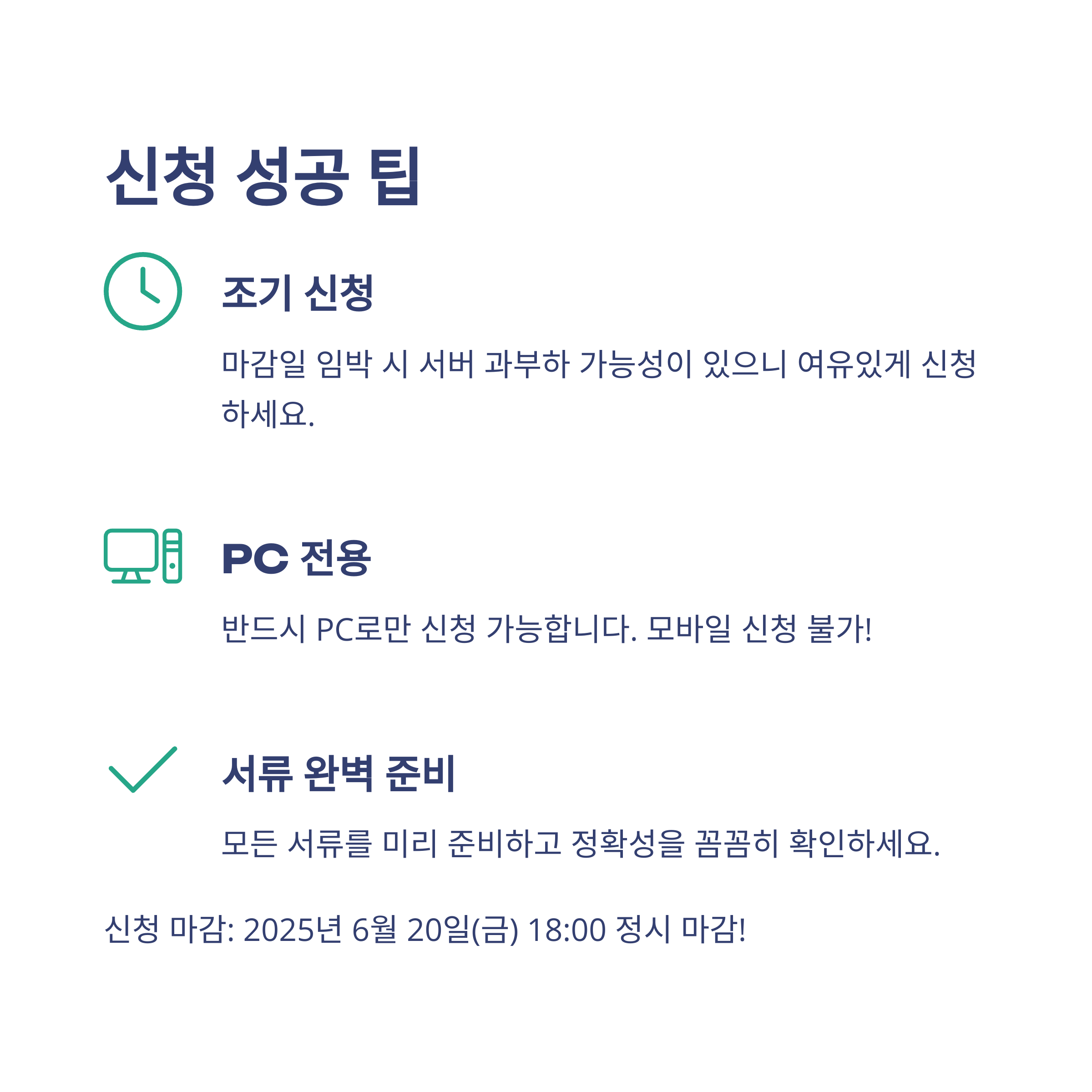 신청 마감이 6월 20일 18시로 임박했습니다. 마감일 당일에는 접속자가 몰려 서버가 불안정할 수 있으니, 가능한 한 조기에 신청을 완료하시기 바랍니다. 또한 모든 서류를 미리 준비하고, PC 환경을 점검한 후 여유있게 신청하시길 권합니다.