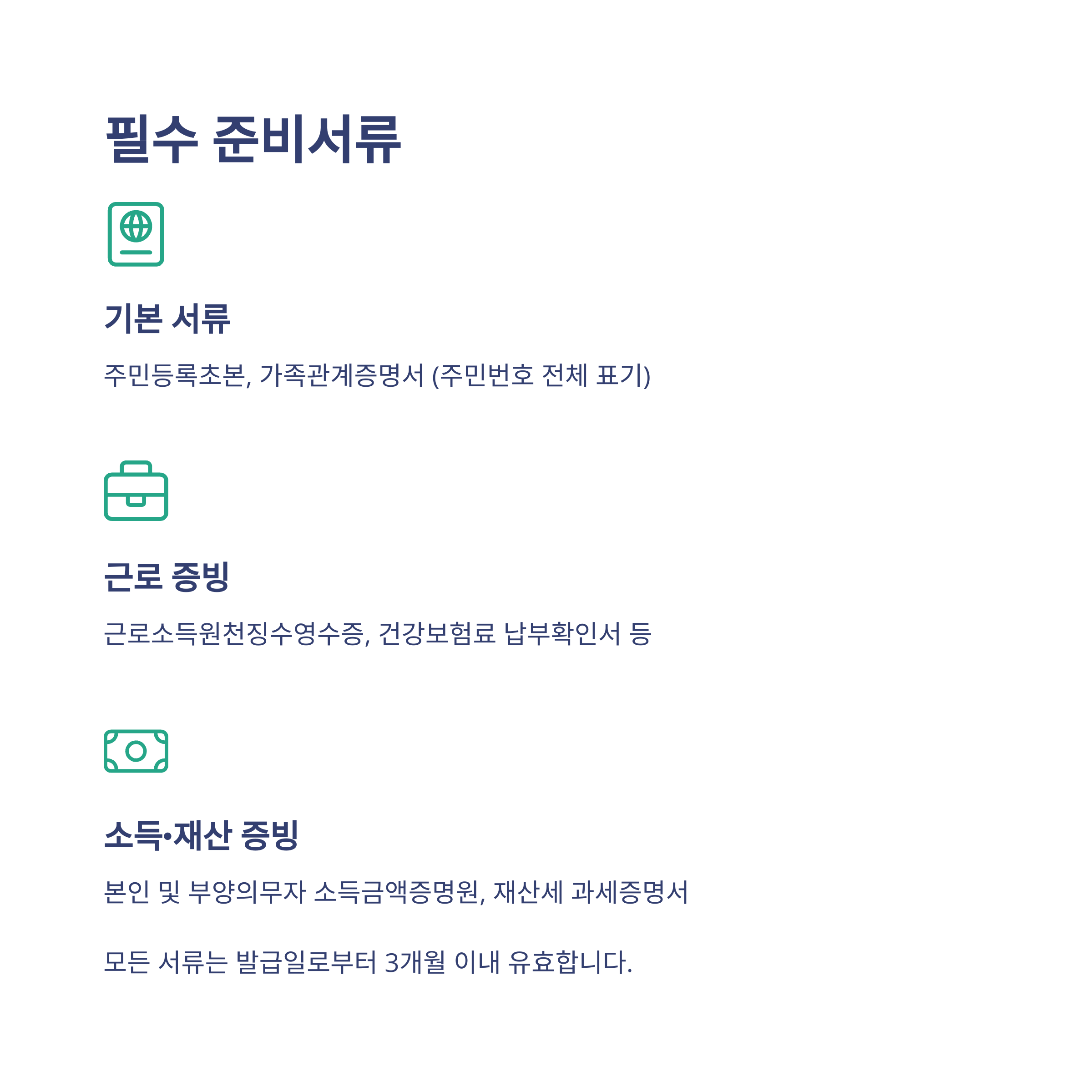 - 발급 기간: 모든 서류는 신청일 기준 3개월 이내 발급분만 유효