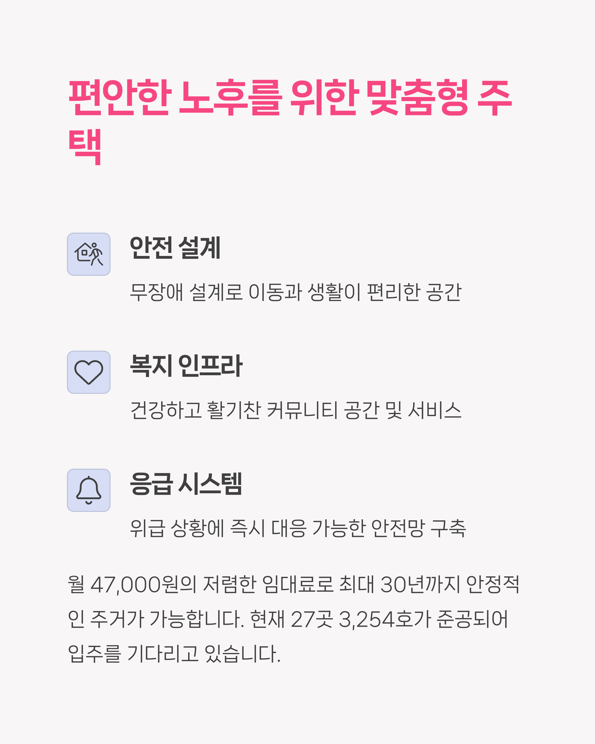 - 특징: 가족 동반 거주 가능 단지 포함, 노인 친화적 인테리어와 응급 호출 시스템 설치