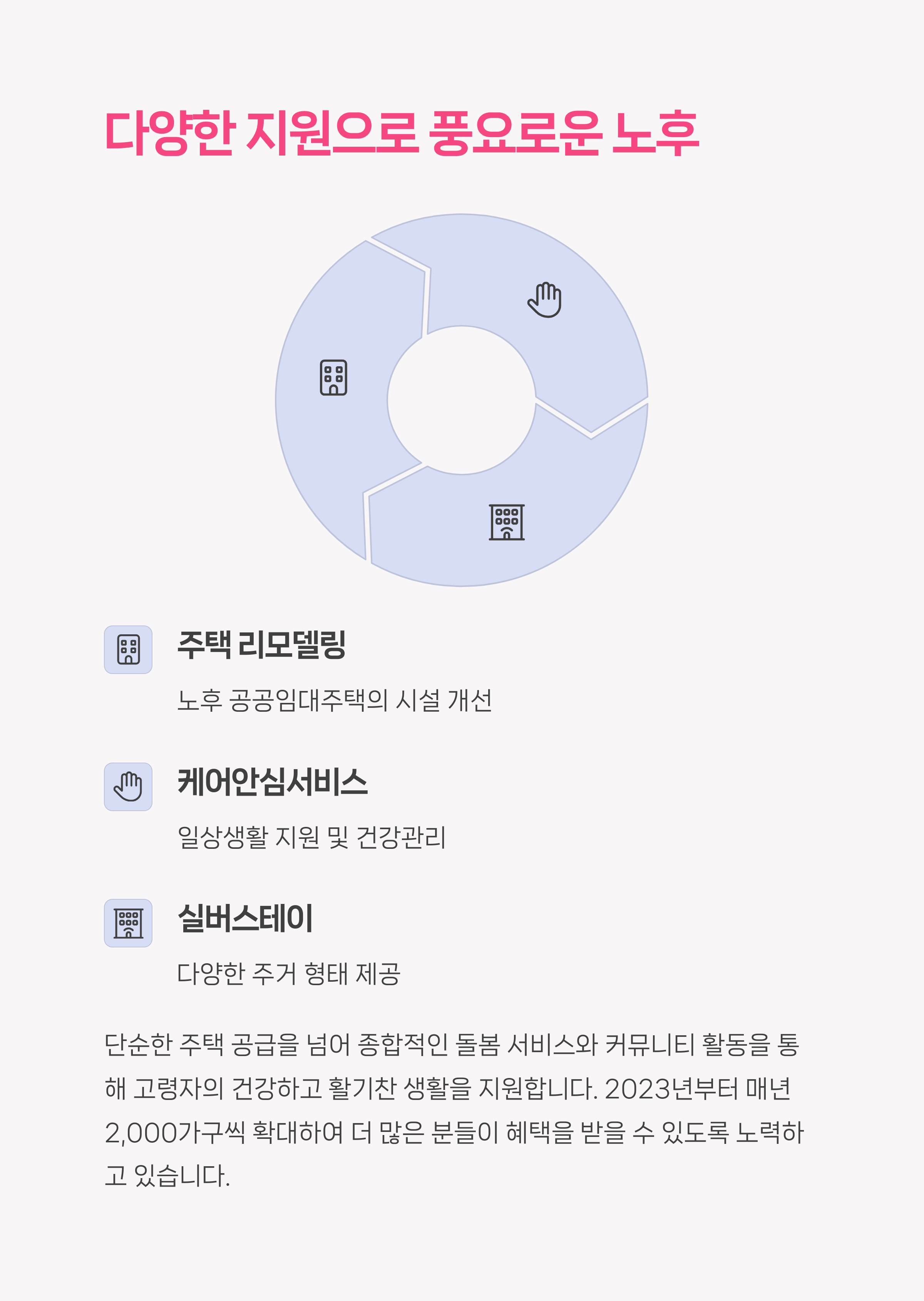 - 주거복지 전문인력 배치로 건강관리 및 돌봄 서비스 제공