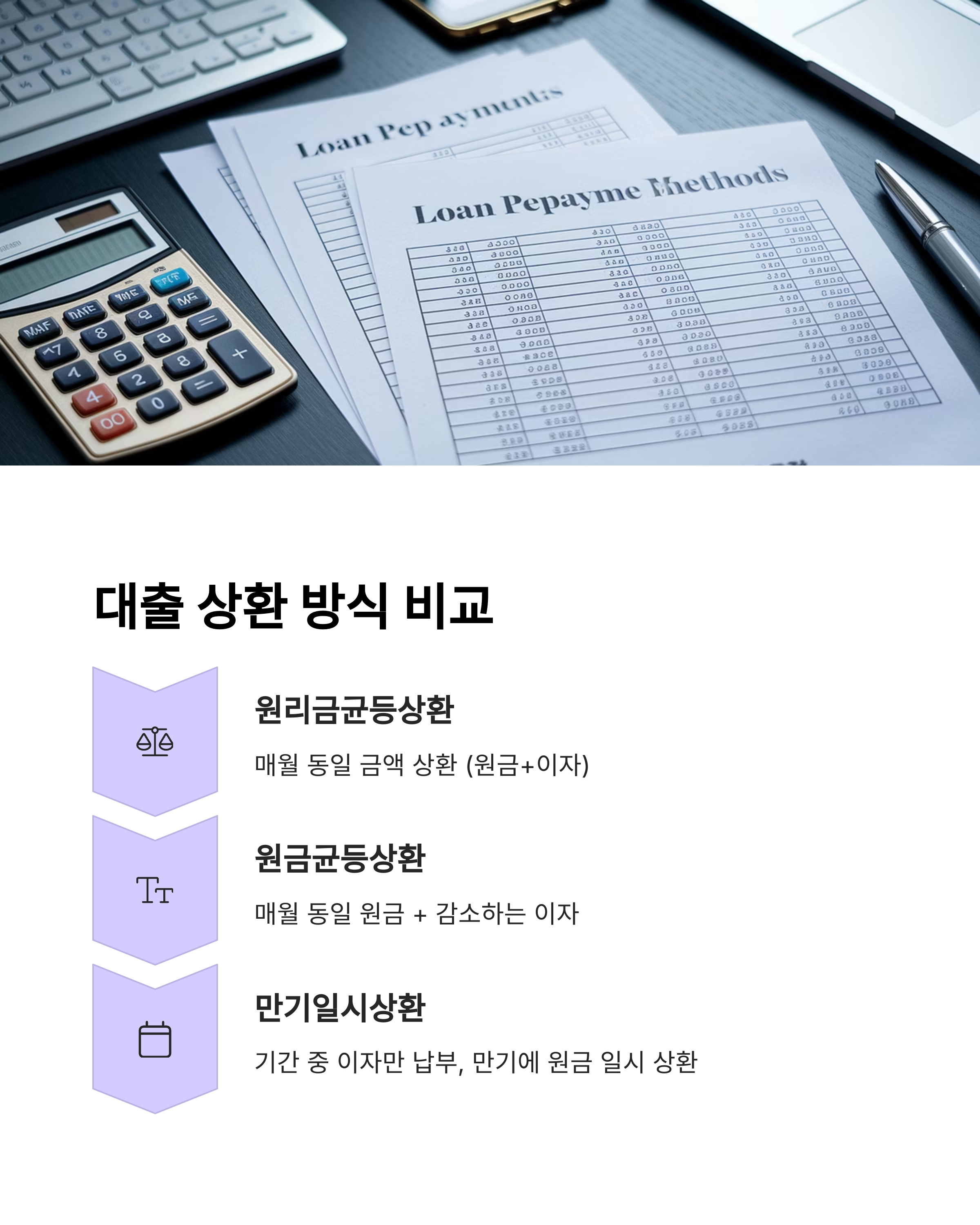 - 만기일시상환: 대출 기간 동안 이자만 납부하고, 만기에 원금을 일시에 상환하는 방식입니다.