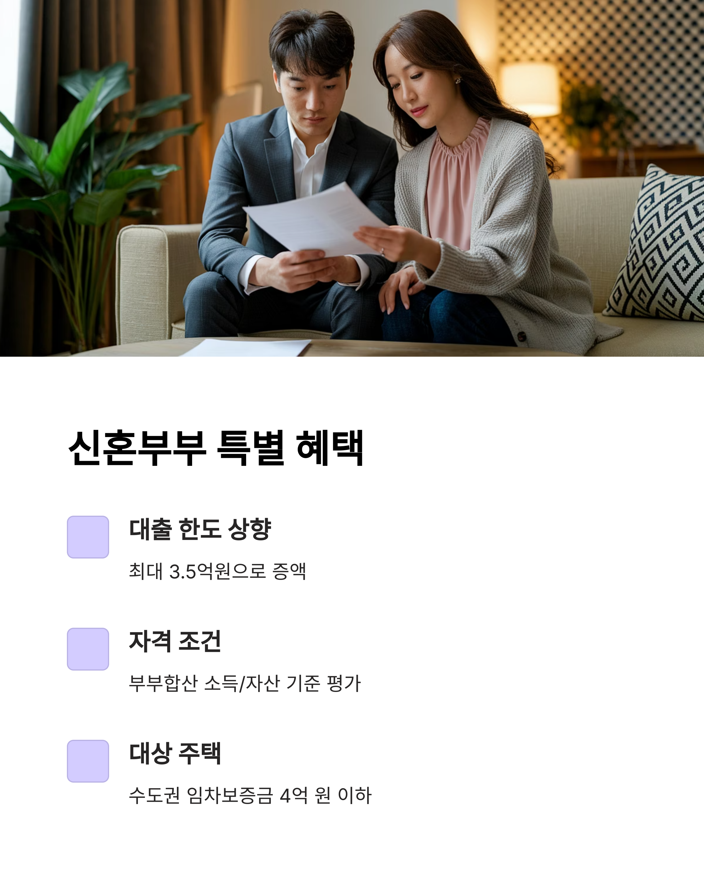 - 신혼부부 대상 전세자금대출 한도 상향 (최대 3억원 → 3.5억원)