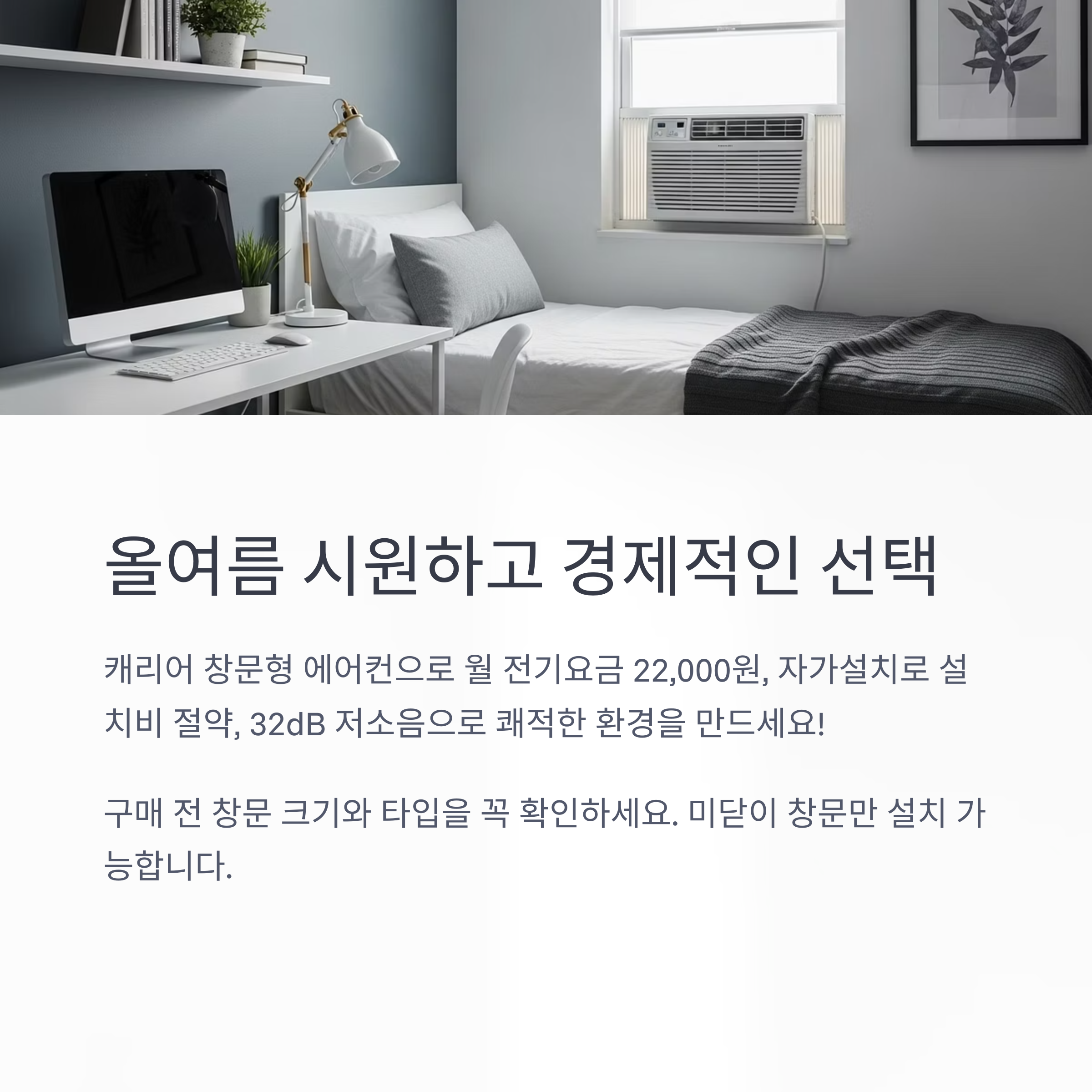 결론적으로, 2025년 캐리어 창문형 에어컨 1등급 인버터 모델들은 소형 공간에서 경제적이고 효율적인 냉방을 원하는 사용자들에게 최적의 선택입니다. 특히 원룸 거주자, 고시원 이용자, 또는 추가 냉방이 필요한 소형 공간 사용자들에게 강력히 추천할 수 있는 제품입니다. 올여름 시원하고 경제적인 냉방을 위해 캐리어 창문형 에어컨을 고려해보시기 바랍니다.
