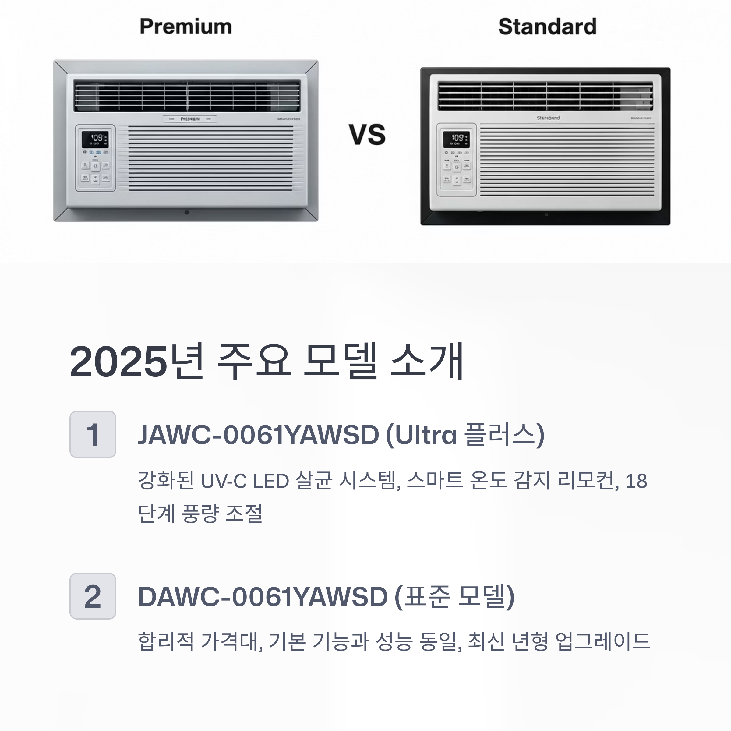 2025년형 표준 모델로 전년도 AAWC-0061YAWSD 모델의 후속작입니다. 기본 기능과 성능은 동일하지만 최신 년형으로 업그레이드된 모델입니다. 합리적인 가격대로 캐리어 창문형 에어컨의 핵심 기능들을 모두 경험할 수 있는 모델입니다.