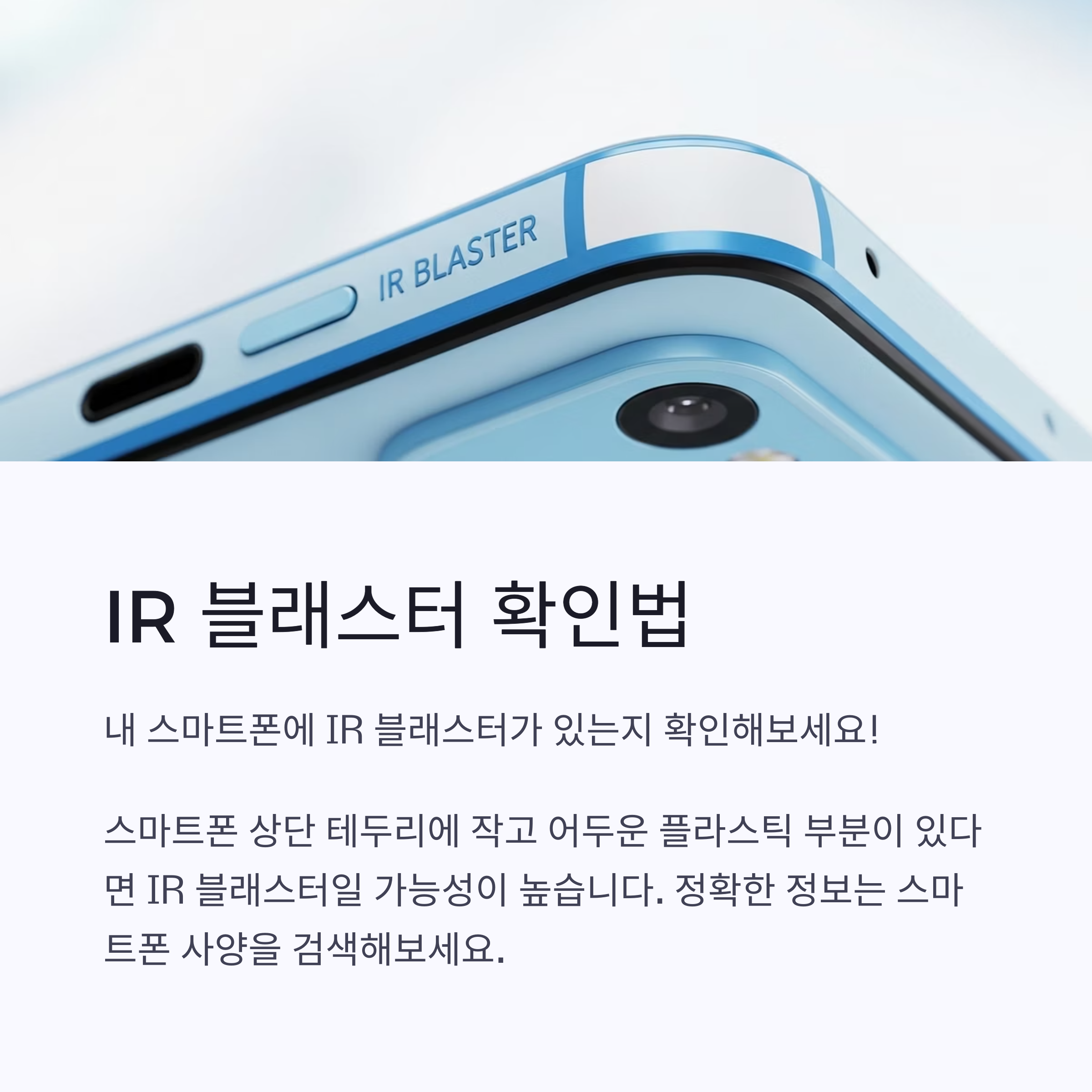 스마트폰 상단 테두리를 자세히 봤을 때, 이어폰 단자와 비슷하지만 더 작고 어두운 플라스틱 부분이 있다면 IR 블래스터일 확률이 높습니다. 정확한 정보는 사용 중인 스마트폰의 스펙(사양)을 검색하여 확인하는 것이 가장 좋습니다. 최근 출시되는 대부분의 스마트폰에는 IR 블래스터가 없는 경우가 많습니다.