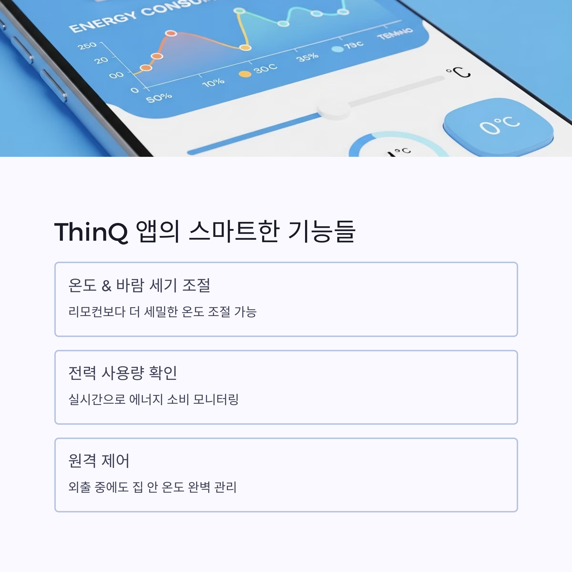 연결이 완료되면 스마트폰으로 온도, 바람 세기, 운전 모드(냉방, 제습 등), 바람 방향 조절은 물론, 전력 사용량 확인, 예약 설정 등 리모컨보다 더 상세하고 스마트한 기능들을 원격으로 제어할 수 있습니다.