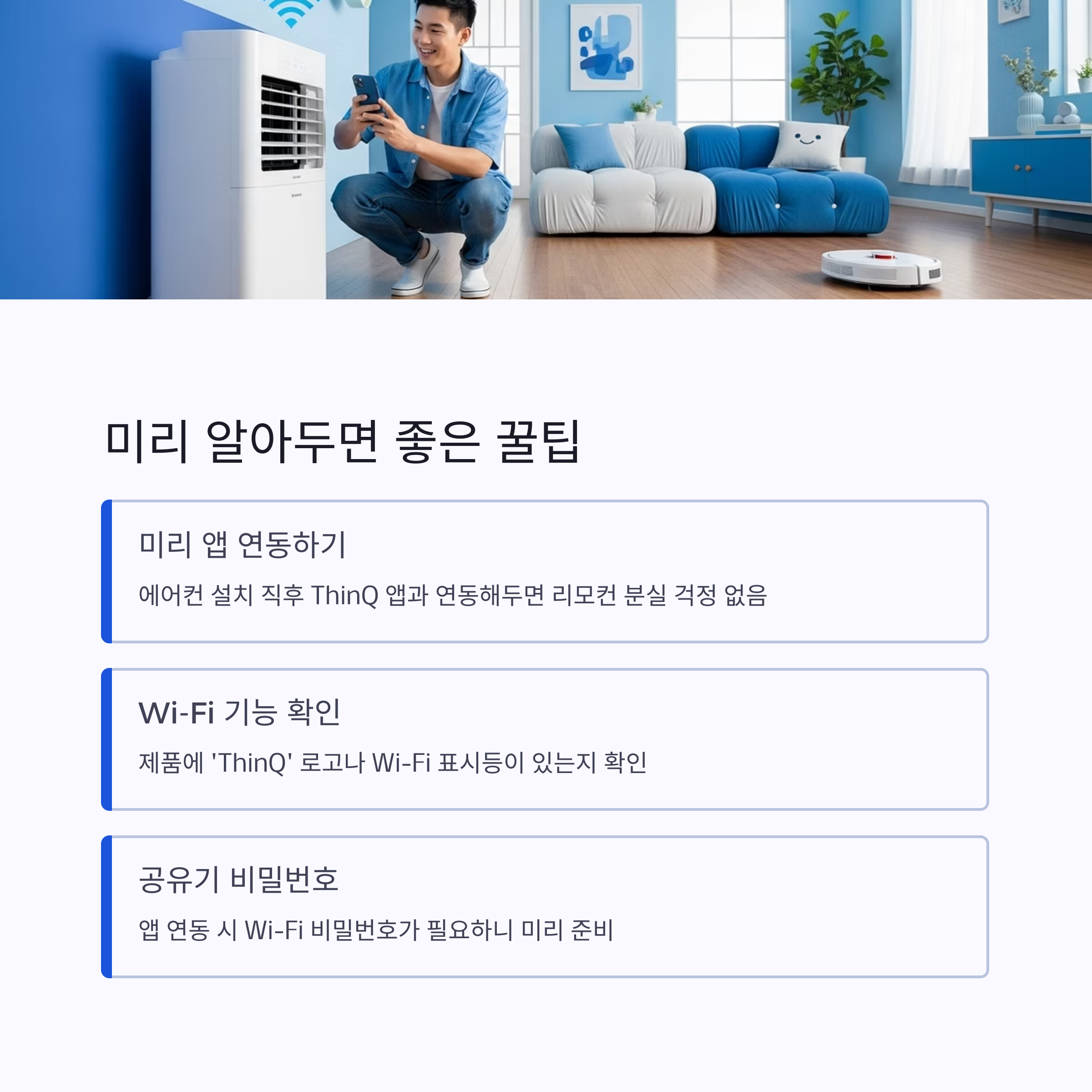 ✅ 공유기 비밀번호 확인: ThinQ 앱 연동 시 집에서 사용하는 Wi-Fi 공유기의 비밀번호가 필요합니다. 미리 확인해두면 과정을 더 빠르고 순조롭게 진행할 수 있습니다.