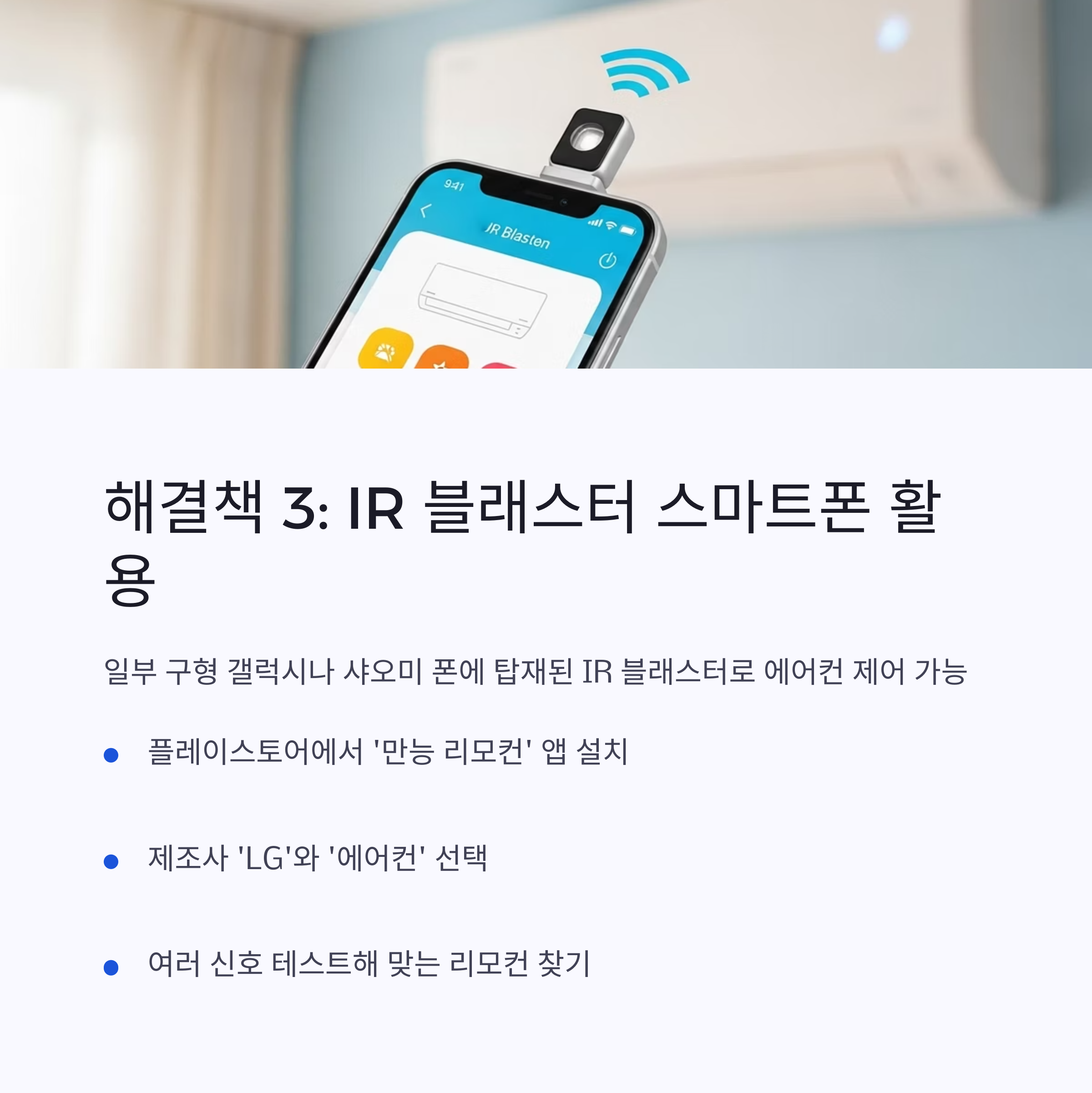 만약 사용 중인 에어컨이 Wi-Fi를 지원하지 않는 구형 모델이고, 스마트폰에 'IR 블래스터(적외선 송신 장치)'가 탑재되어 있다면 '통합 리모컨' 앱을 활용해 볼 수 있습니다. IR 블래스터는 일부 구형 갤럭시 시리즈나 샤오미 스마트폰에 주로 탑재되었습니다.