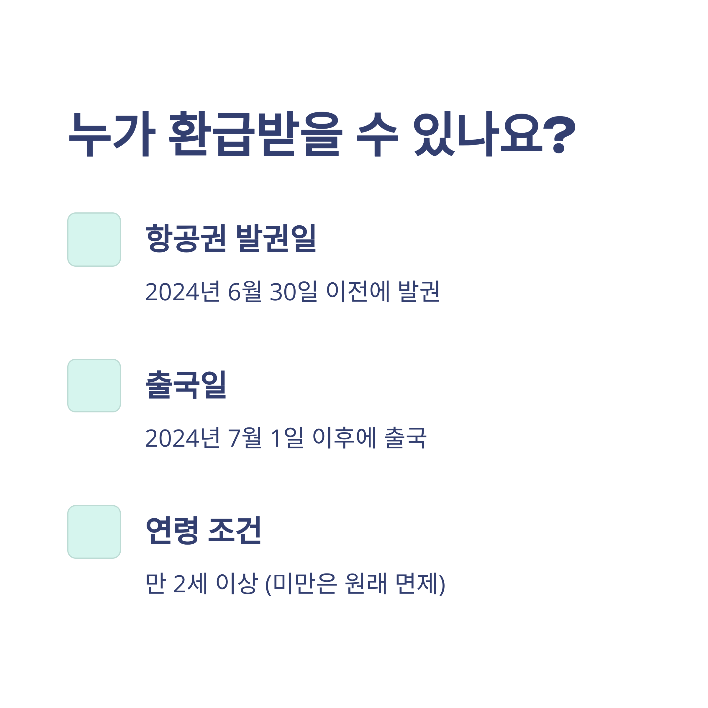 - 추가 환급 대상: 2024년 7월 1일 이후 출국자 중 성인