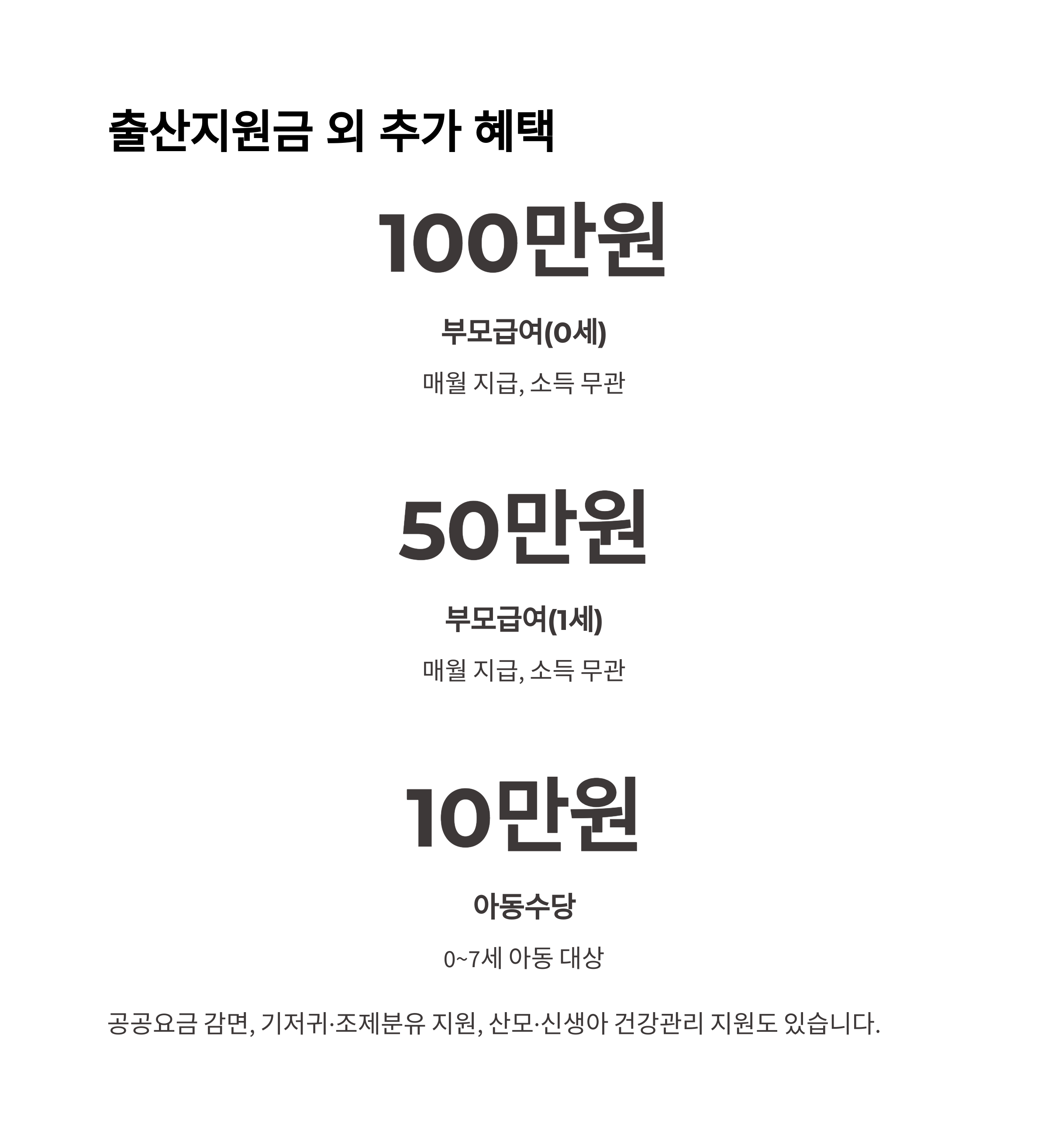 • 혜택: 산모·신생아 건강관리사 파견(5~25일)