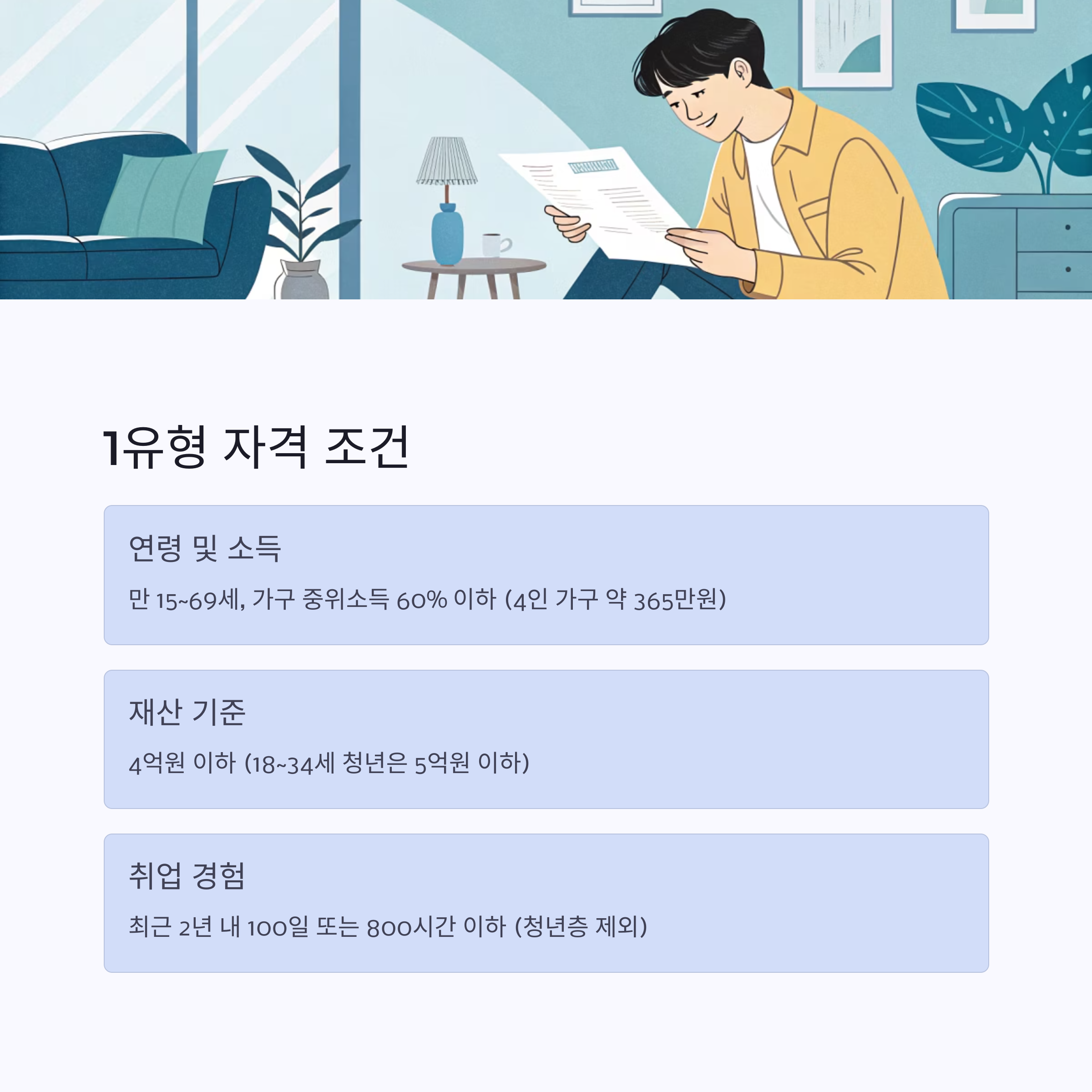 📌 1유형 세부 분류: 요건심사형(조건 충족 시 자동 선발), 선발형 청년층(경쟁을 통한 선발), 선발형 비경제활동자로 구분되며, 각각 선발 기준과 지원 내용이 다릅니다.