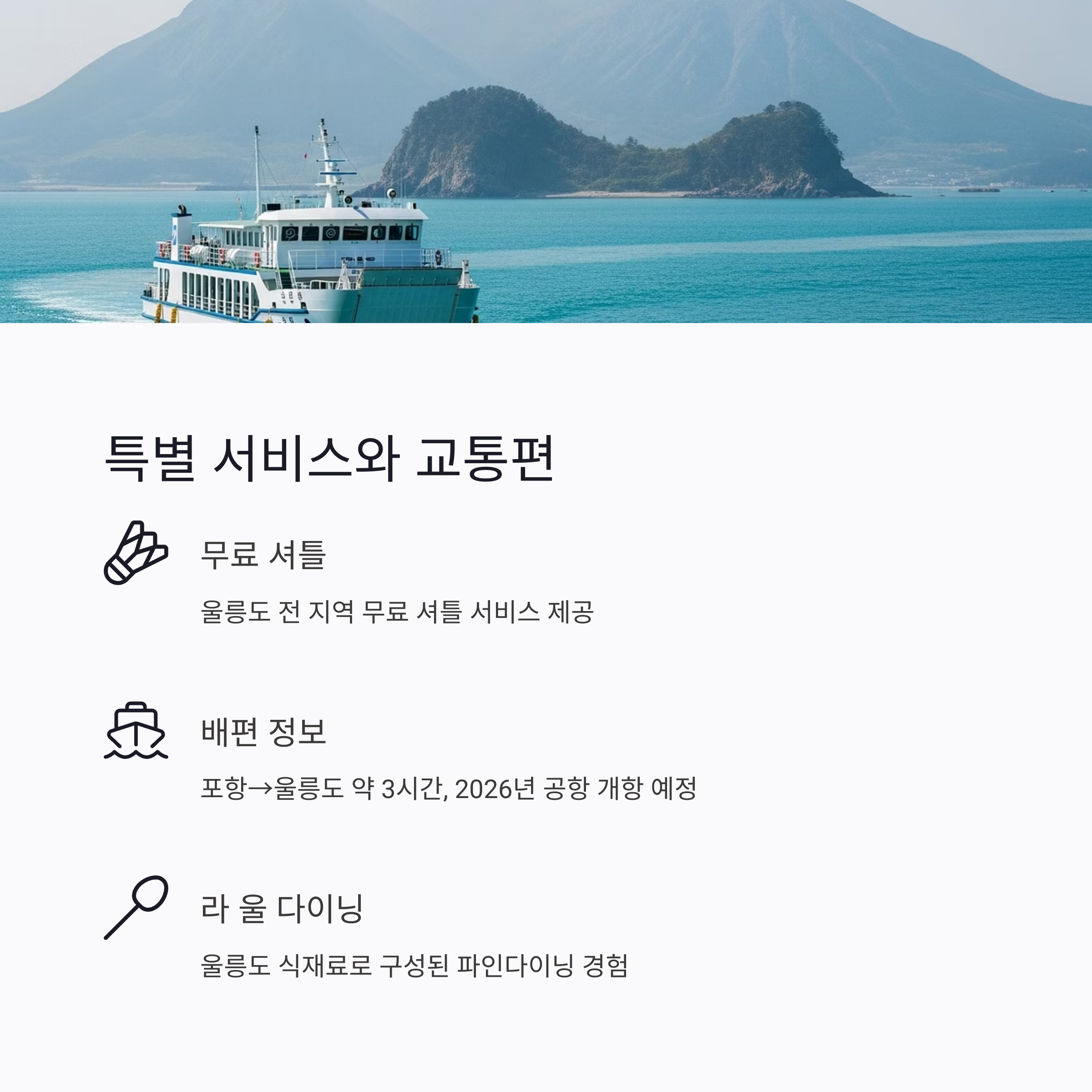 - 울릉도 전 지역 무료 셔틀 서비스 (픽업/드롭)