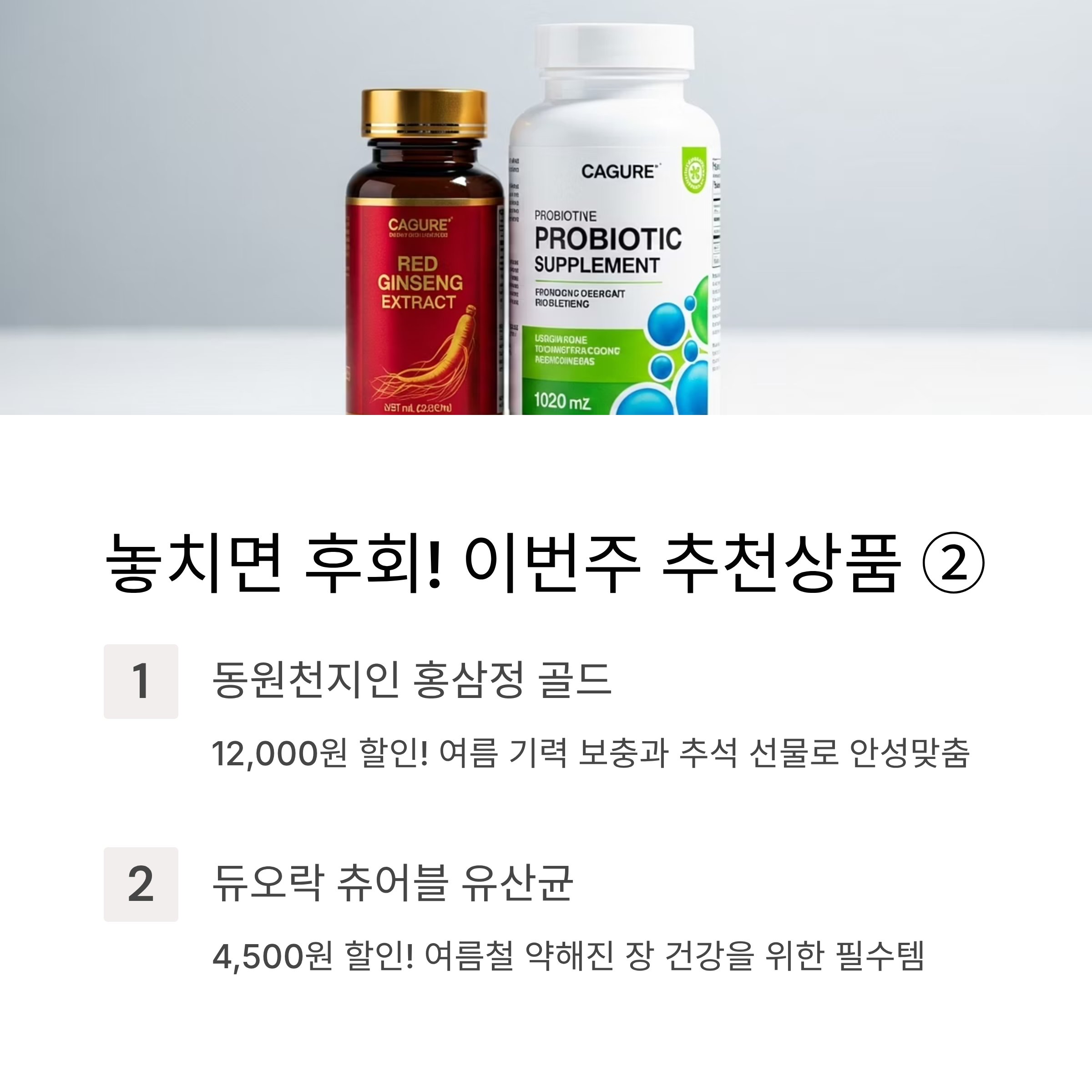 3. 동원천지인 홍삼정 골드 (1만 2천원 할인): 여름 막바지 기력 보충과 다가올 추석 부모님 선물을 미리 준비하기에 안성맞춤입니다. 믿을 수 있는 브랜드의 홍삼정을 할인된 가격에 구매하세요.