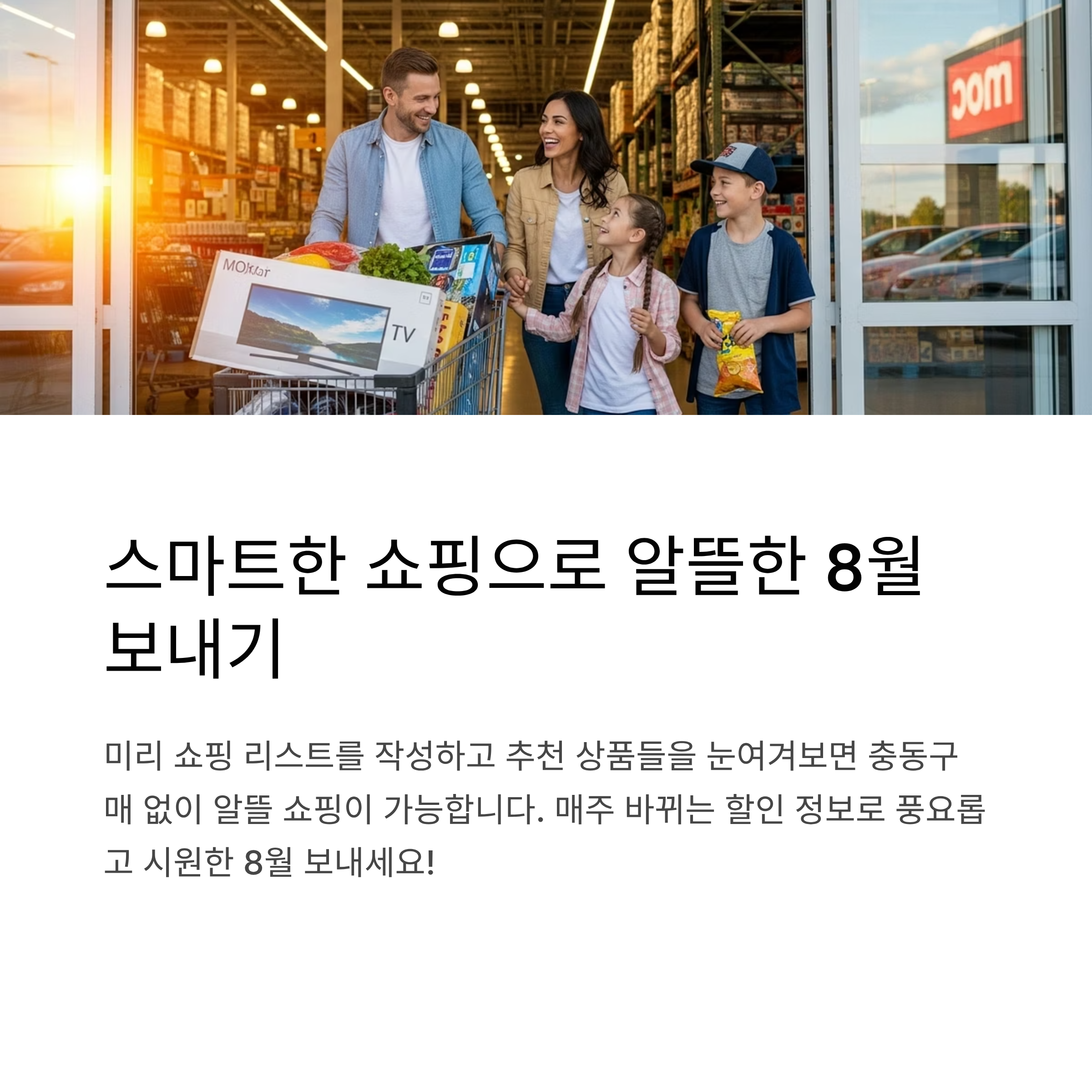 코스트코의 진정한 매력은 좋은 품질의 제품을 저렴하게 구매하는 데 있습니다. 하지만 아무 계획 없이 방문했다가는 충동구매로 이어지기 쉽습니다. 오늘 알려드린 2025년 8월 둘째 주 할인 정보를 바탕으로 미리 쇼핑 리스트를 작성하고, 추천 상품들을 눈여겨보신다면 분명 후회 없는 알뜰 쇼핑을 하실 수 있을 겁니다. 매주 새롭게 바뀌는 할인 상품 정보를 놓치지 마시고, 스마트한 쇼핑으로 풍요롭고 시원한 8월을 보내시길 바랍니다.