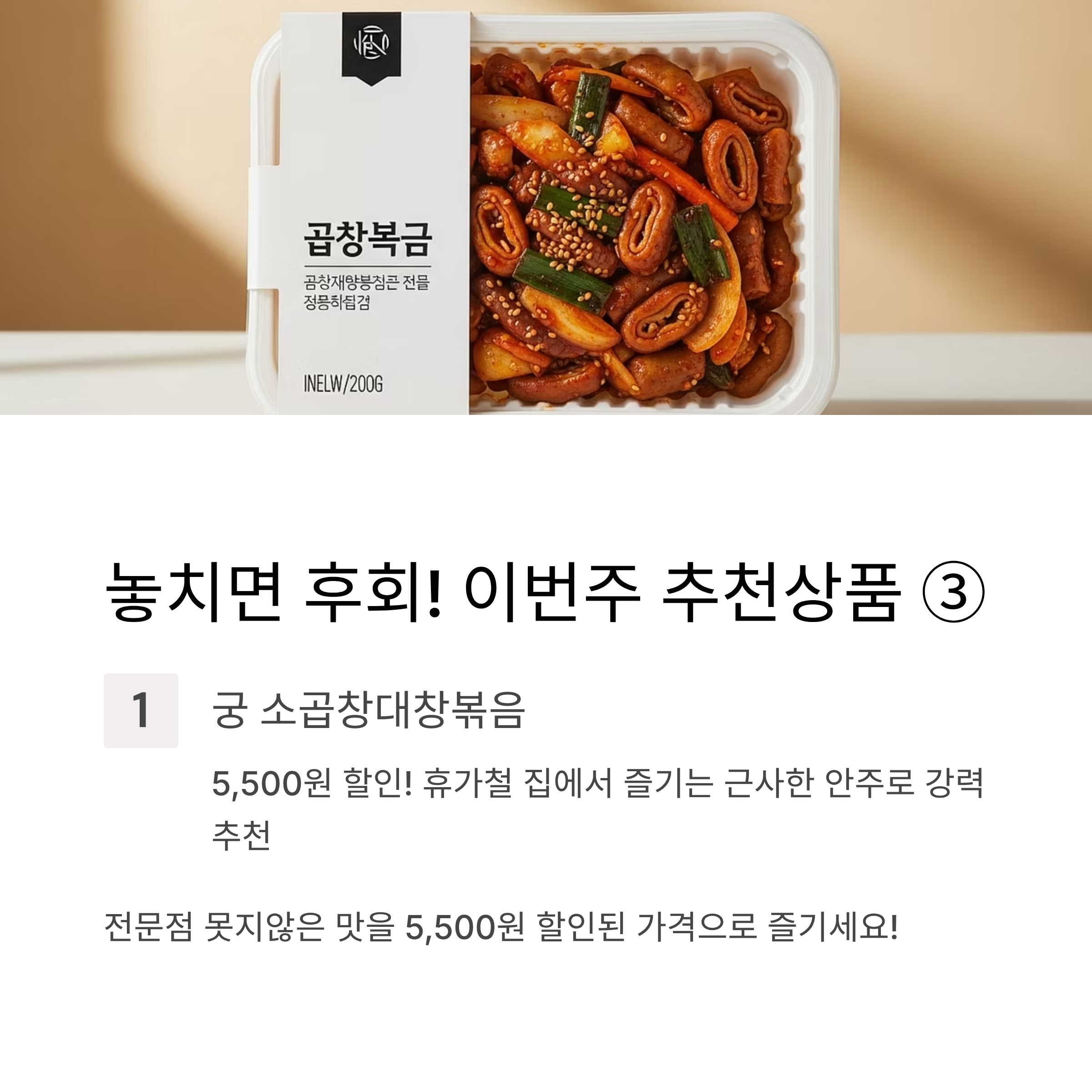 5. 궁 소곱창대창볶음 (5,500원 할인): 휴가철 집에서 즐기는 근사한 안주나 특별한 저녁 메뉴로 강력 추천합니다. 전문점 못지않은 맛의 곱창대창볶음을 5,500원 할인된 가격으로 즐길 수 있습니다.