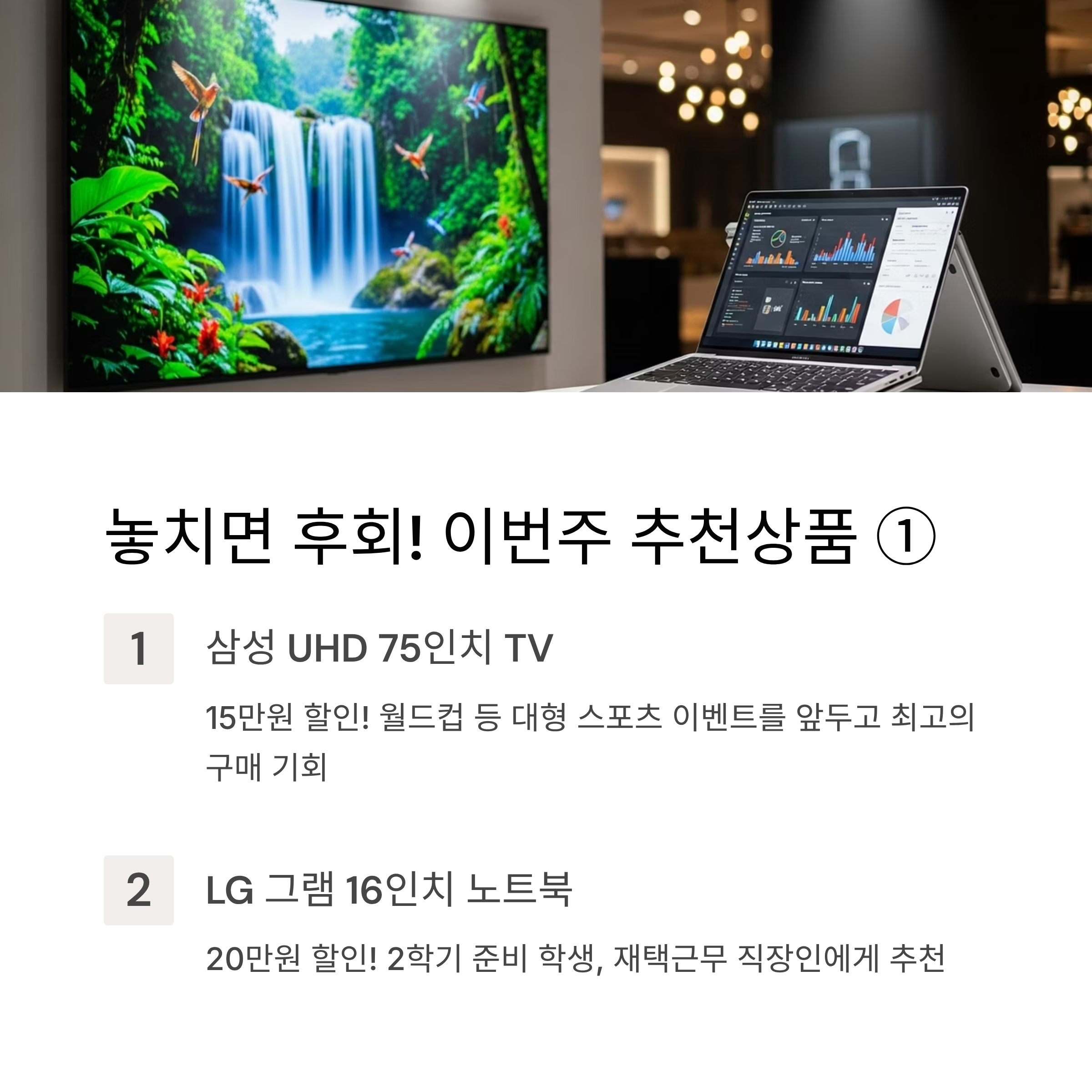 1. 삼성 UHD 75인치 TV (15만원 할인): 월드컵 등 대형 스포츠 이벤트가 다가오는 하반기를 앞두고 TV 교체를 고민 중이라면 최고의 기회입니다. 75인치 대화면 TV를 15만원 할인된 가격에 구매할 수 있습니다.
