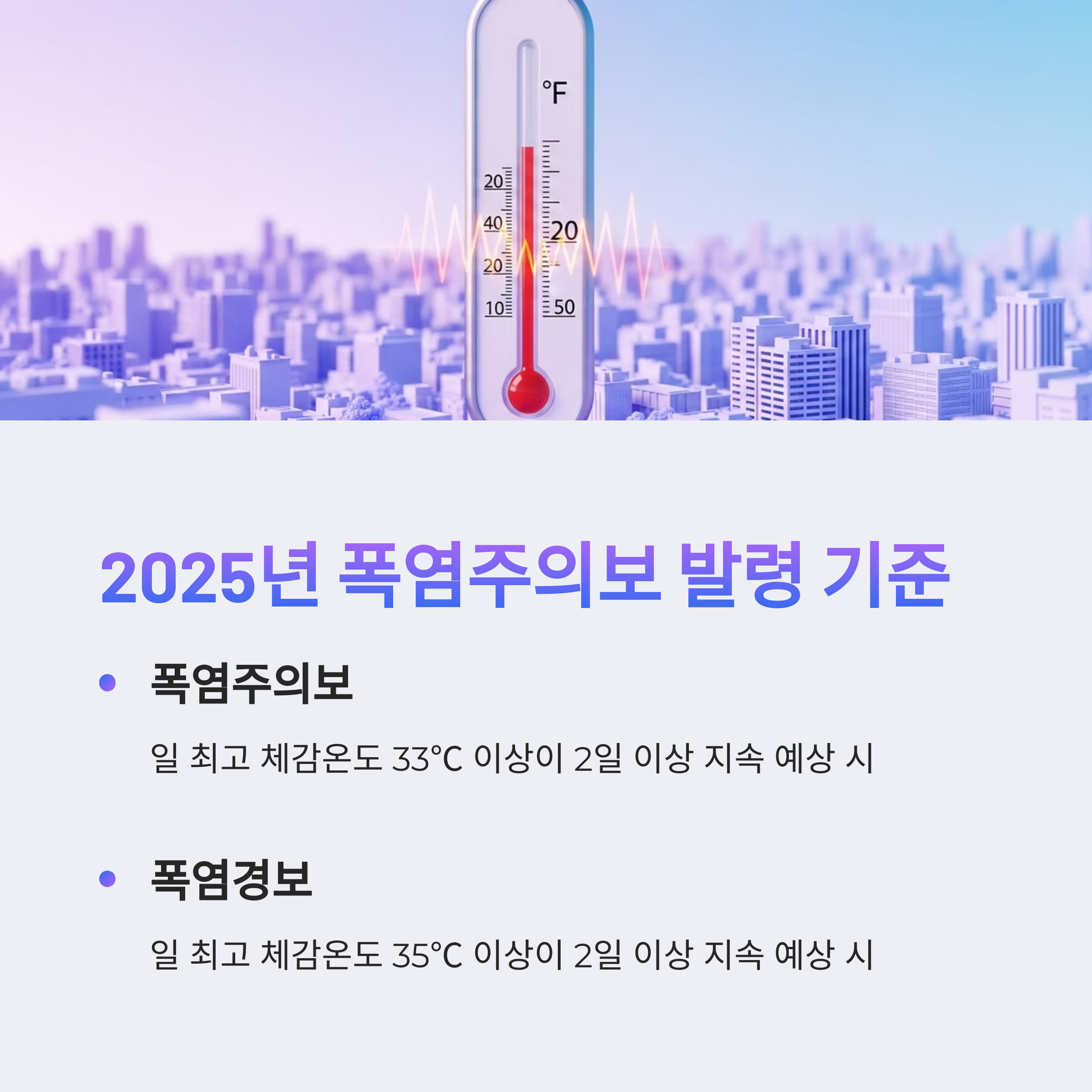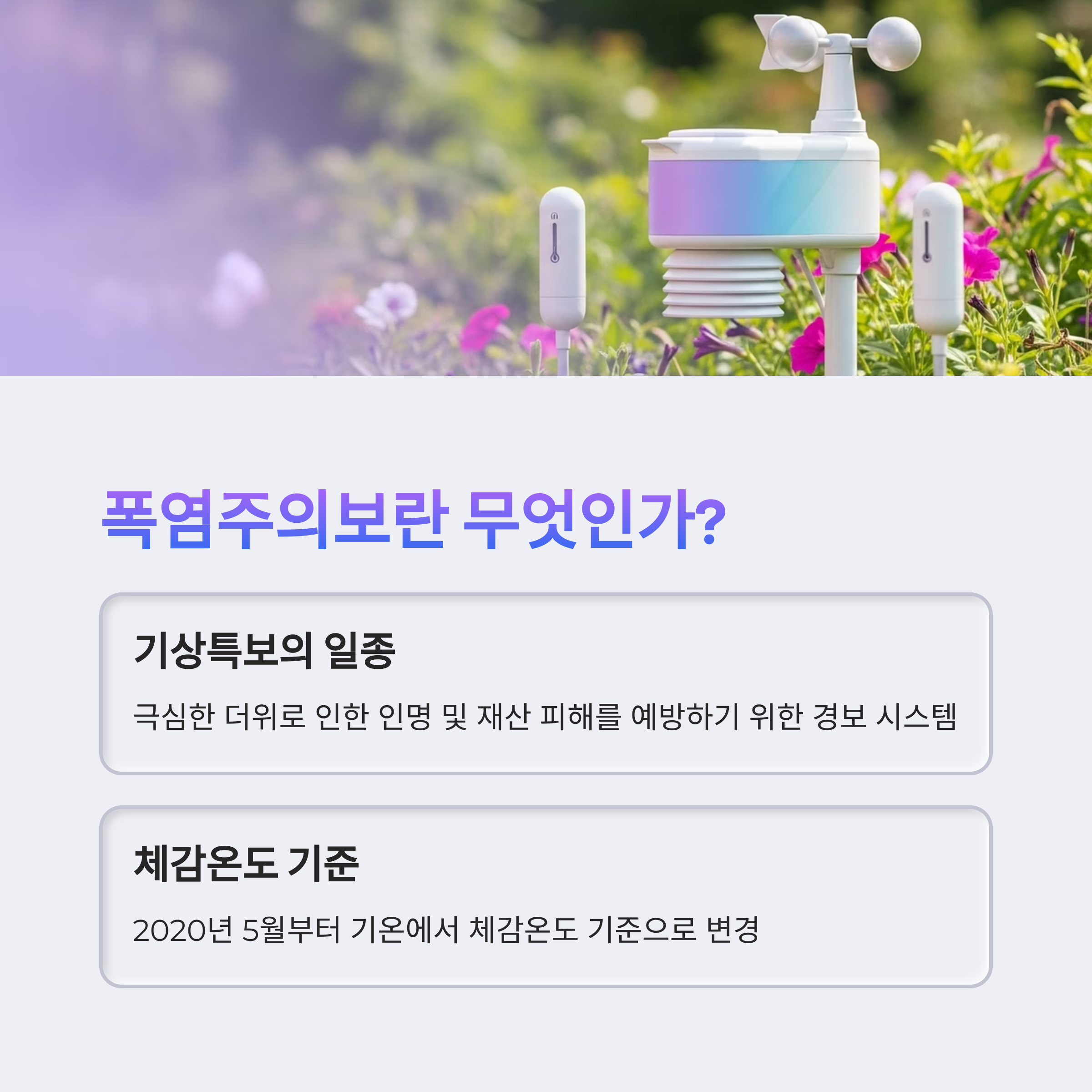 폭염특보는 주의보와 경보로 구분되며, 각각의 기준과 대응 방안이 다르게 적용됩니다. 특히 2020년 5월부터 기존의 기온 기준에서 체감온도 기준으로 변경되어 국민들이 실제로 느끼는 더위를 보다 정확하게 반영하고 있습니다.