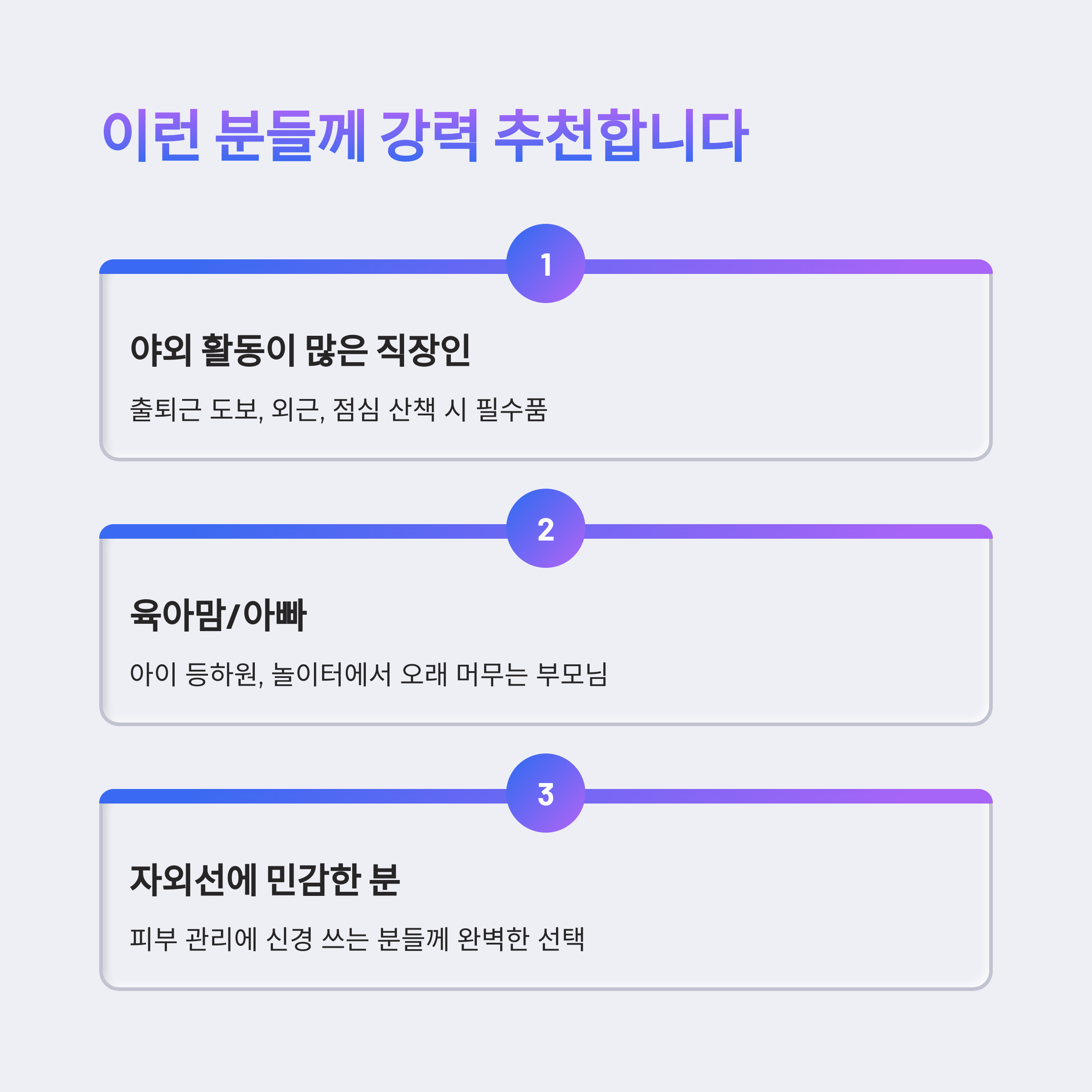 3개월간의 실사용 경험을 바탕으로 해누아 양산을 추천할 수 있는 대상과 구매 시 고려사항을 정리했습니다. 개인의 라이프스타일과 필요에 따라 구매 여부를 결정하실 수 있도록 가이드를 제공합니다.