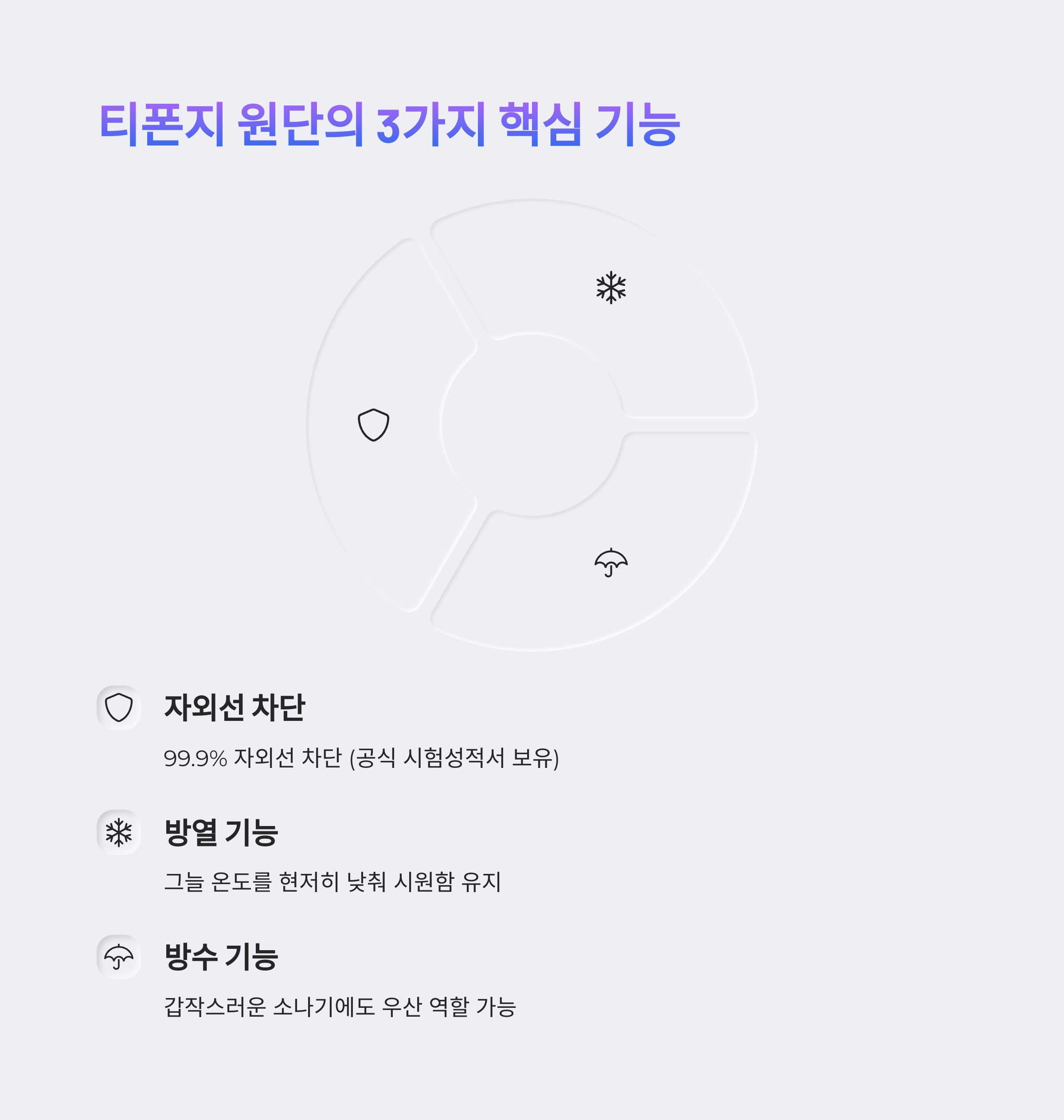 특히 티폰지 원단을 사용한 해누아 양산은 99.9% 자외선 차단과 함께 방열, 방수 기능까지 갖춘 멀티 기능성 제품입니다. 일반 양산과는 차원이 다른 성능을 자랑하며, 폭염 속에서도 쾌적한 외출을 가능하게 해줍니다.