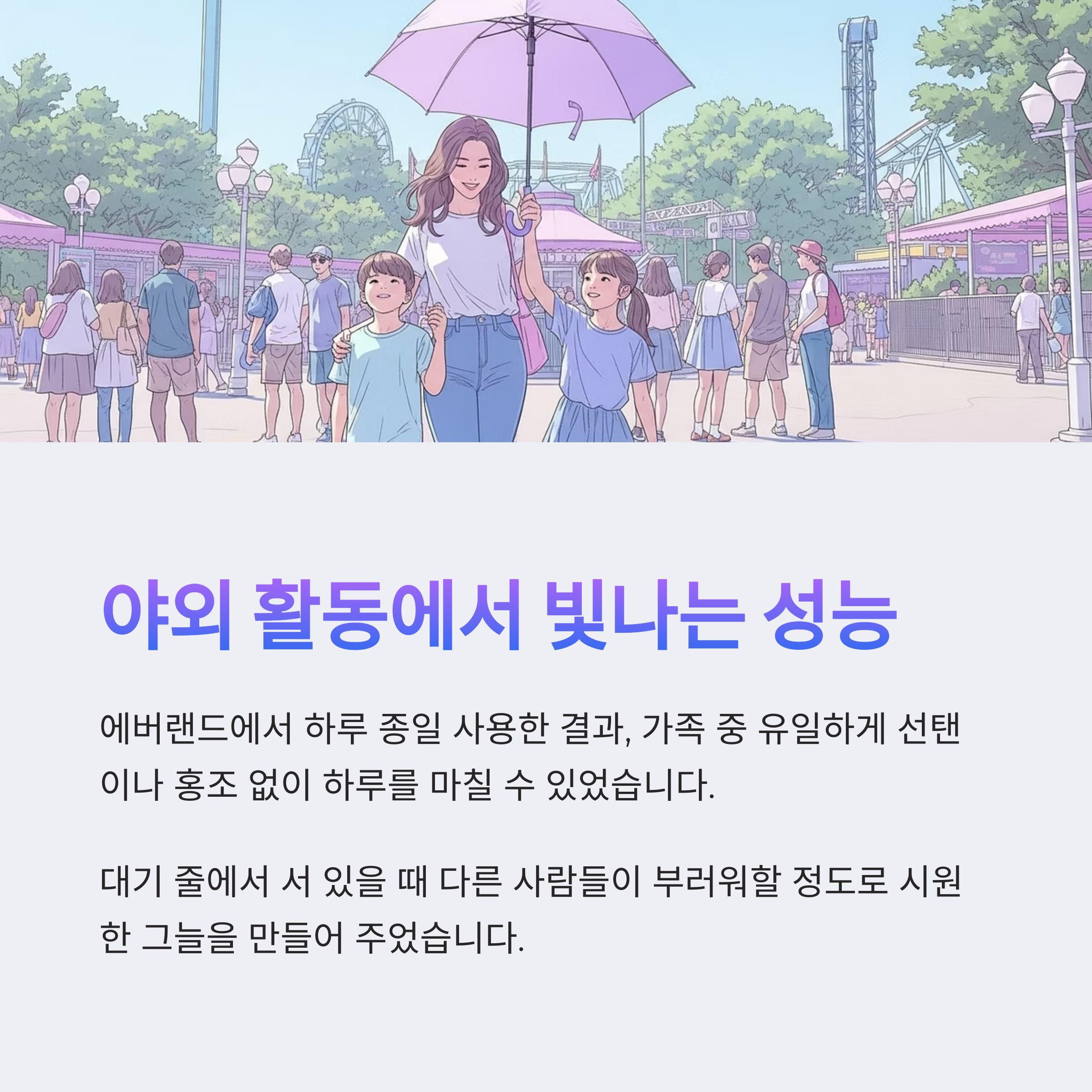 에버랜드에서 하루 종일 사용한 결과, 가족 중 유일하게 선탠이나 홍조 없이 하루를 마칠 수 있었습니다. 특히 대기 줄에서 서 있을 때 다른 사람들이 부러워할 정도로 시원한 그늘을 만들어 주었습니다.
