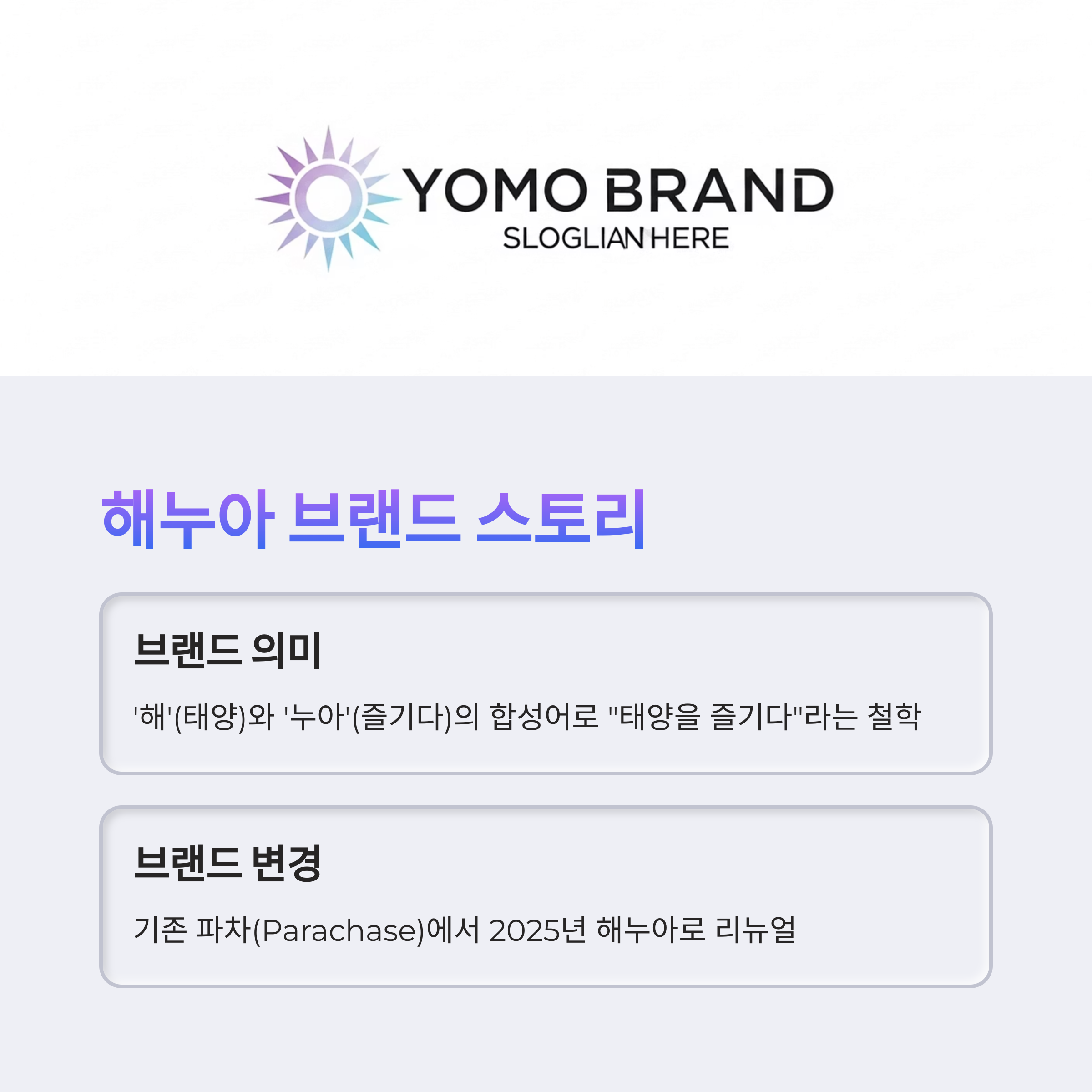 해누아(Haenua)는 기존 파차(Parachase) 브랜드에서 2025년 새롭게 변경된 브랜드명입니다. '해'는 태양을, '누아'는 즐기다의 의미를 담고 있어 "태양을 즐기다"라는 브랜드 철학을 담고 있습니다. 단순히 햇빛을 피하는 것이 아니라, 충분한 보호 하에 야외 활동을 즐길 수 있도록 돕는다는 의미입니다.
