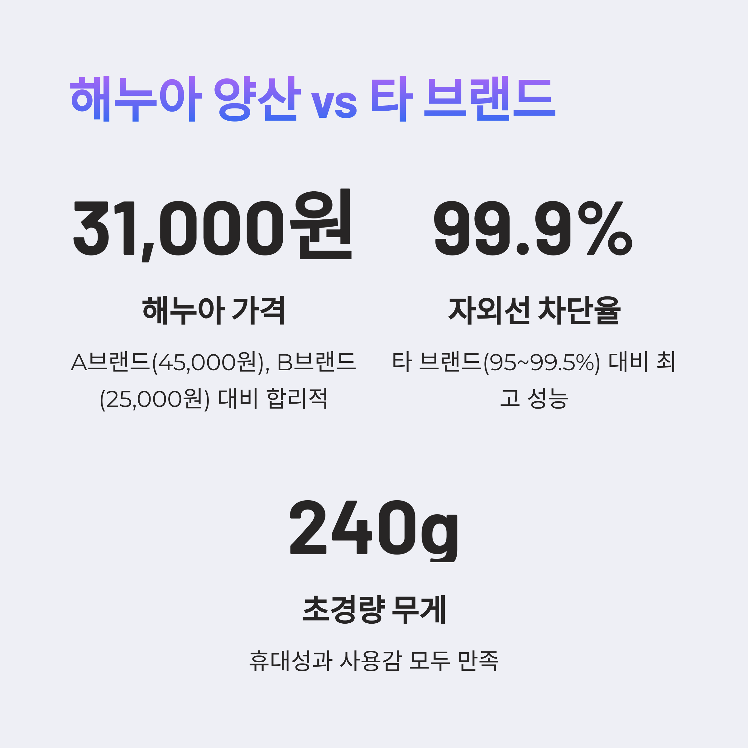 - 자외선 차단: 99.9% 공식 시험성적서 보유