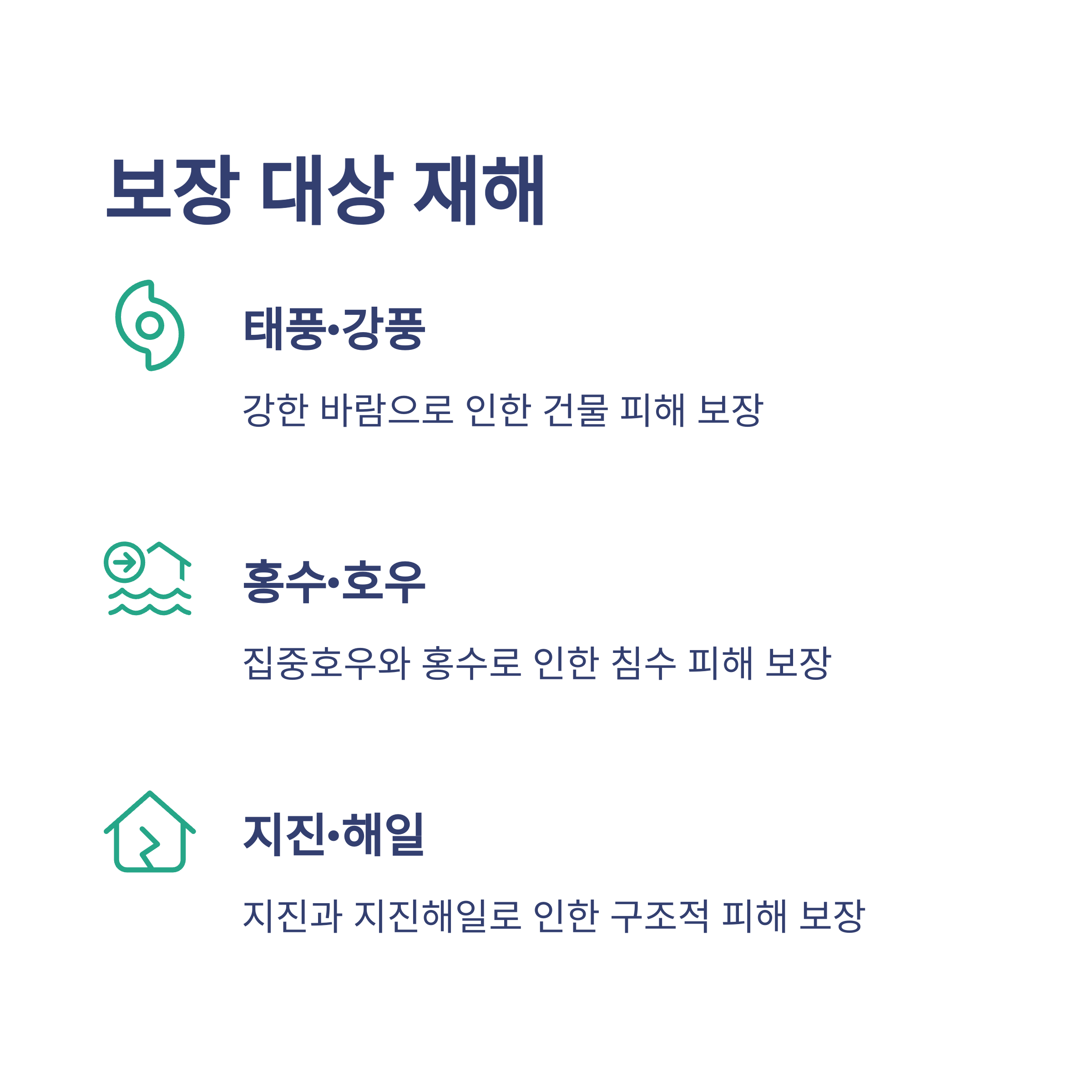 - 보장 내용: 건물 손해, 임시거주비, 잔해제거비 등