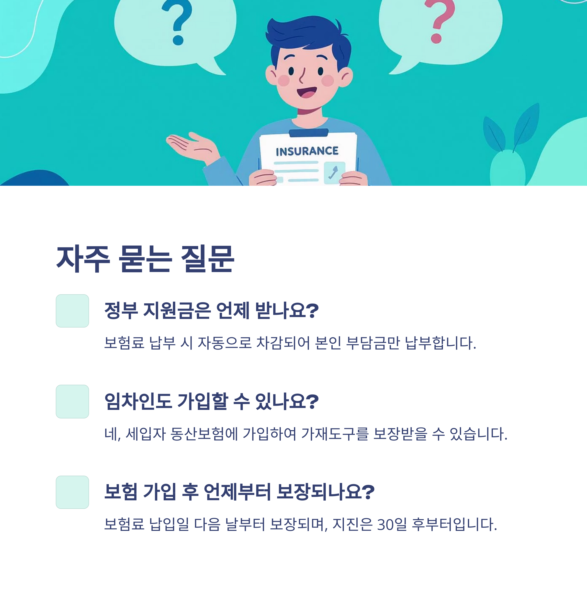A. 네, 가능합니다. 세입자는 '세입자 동산보험'에 가입하여 가재도구와 집기류를 보장받을 수 있습니다. 건물주 동의 없이도 가입 가능하며, 지자체 단체보험으로 가입하시면 더욱 저렴합니다.