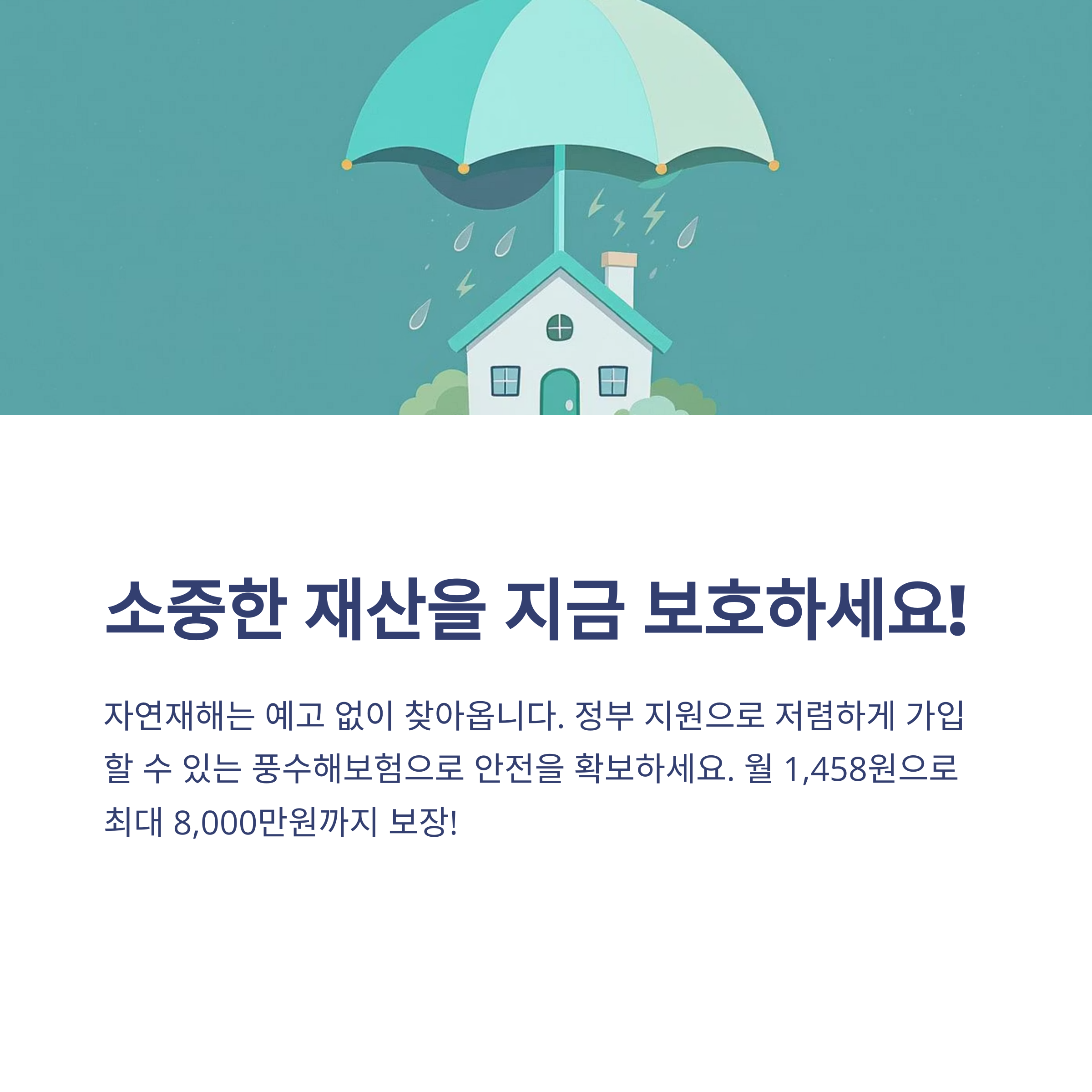 소중한 재산을 자연재해로부터 보호하는 것은 더 이상 개인의 몫이 아닙니다. 정부가 적극 지원하는 풍수해보험으로 안전한 삶을 만들어 가세요. 작은 투자로 큰 안심을 얻을 수 있는 현명한 선택입니다.