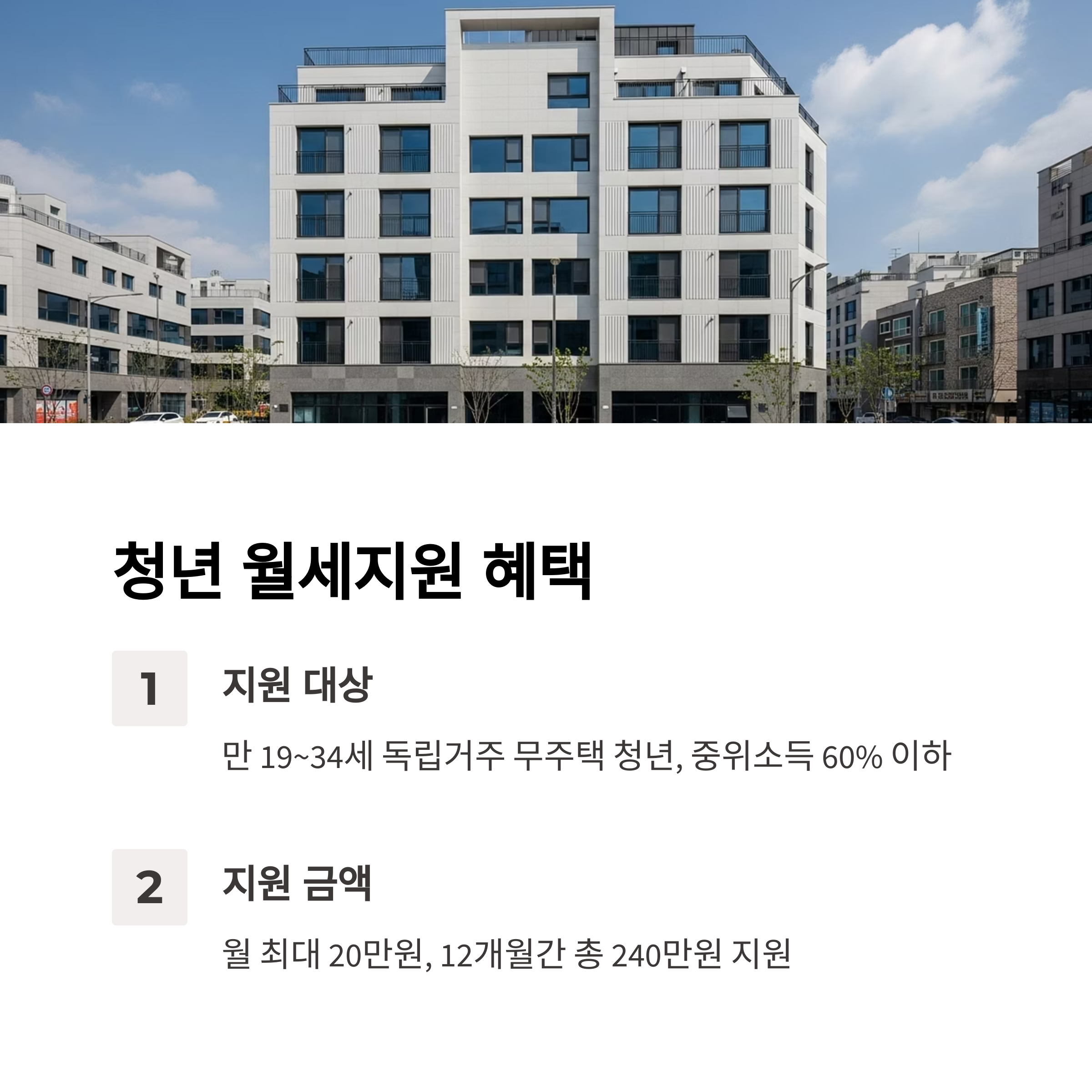 - 월세지원: 최대 월 20만원, 12개월간 지원