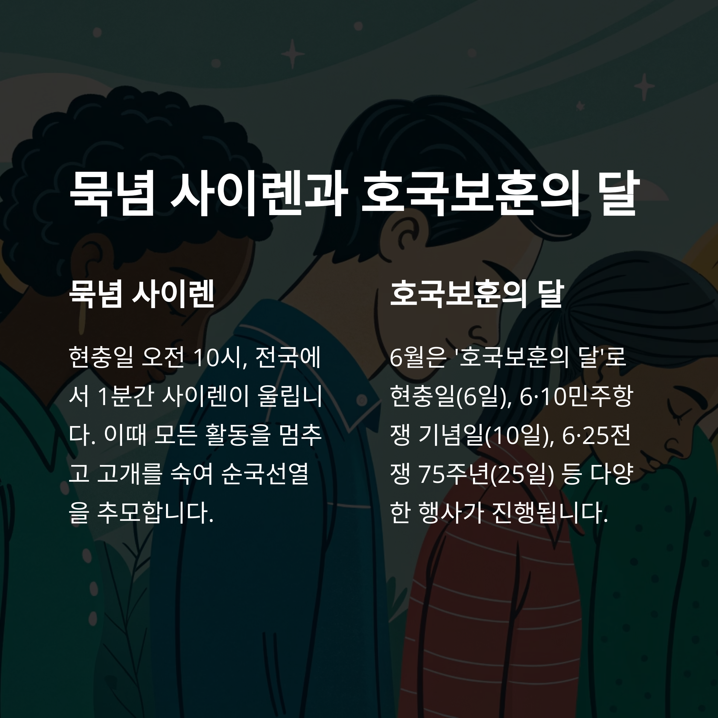 현충일 오전 10시, 전국에서 울리는 묵념 사이렌은 현충일의 가장 중요한 순간 중 하나입니다. 이 1분간의 묵념은 모든 국민이 함께 참여하여 순국선열과 호국영령의 숭고한 희생을 기리는 시간입니다.