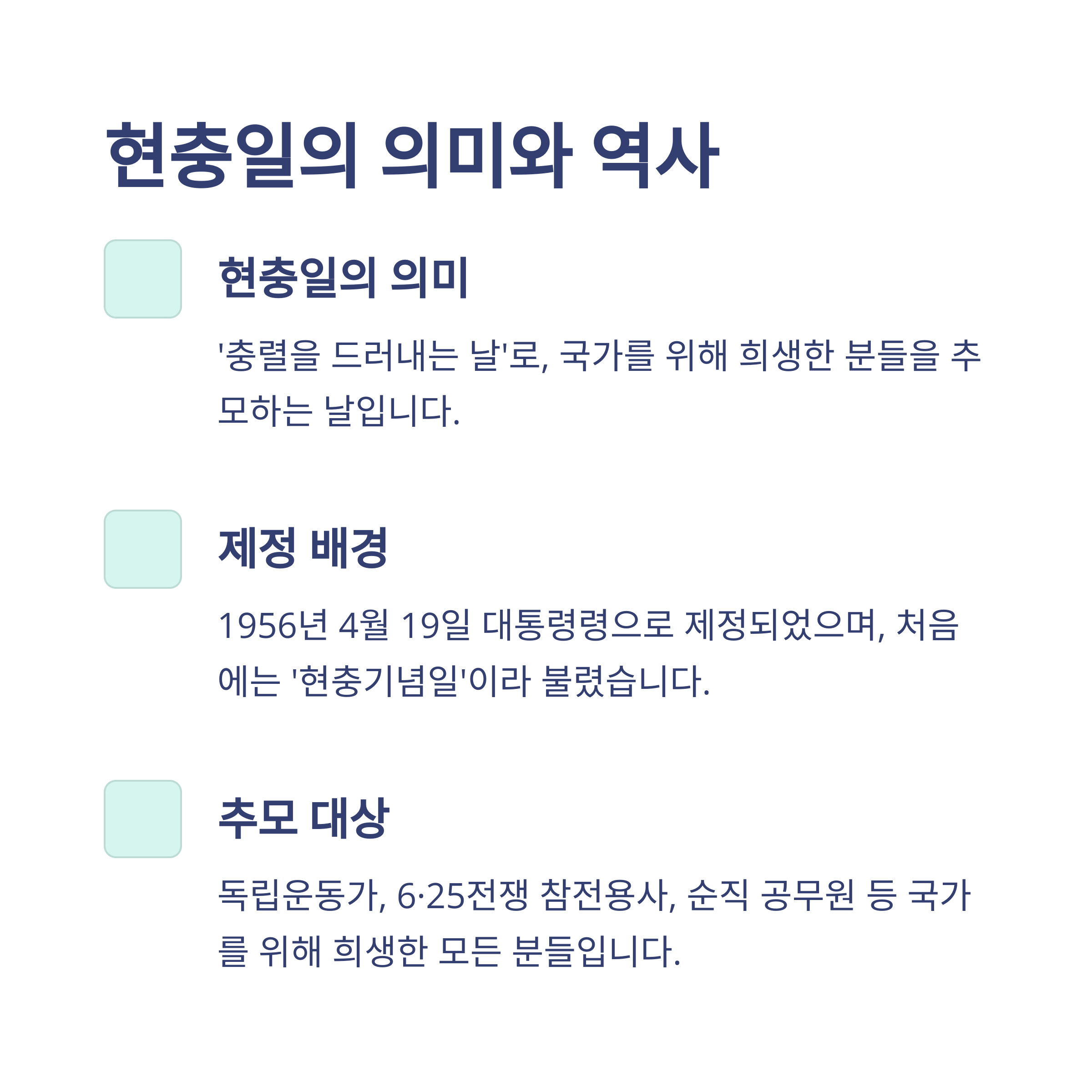 현충일의 역사는 1956년 4월 19일 대통령령 제1145호로 제정되었으며, 당시에는 '현충기념일'이라는 명칭으로 시작되었습니다. 6·25참전용사를 비롯해 국가를 위해 희생해주신 모든 분들을 추모하는 날로 지정된 이후, 1975년 1월 27일 '관공서의 공휴일에 관한 규정'이 개정되면서 현재의 '현충일'로 공식 개칭되었습니다.