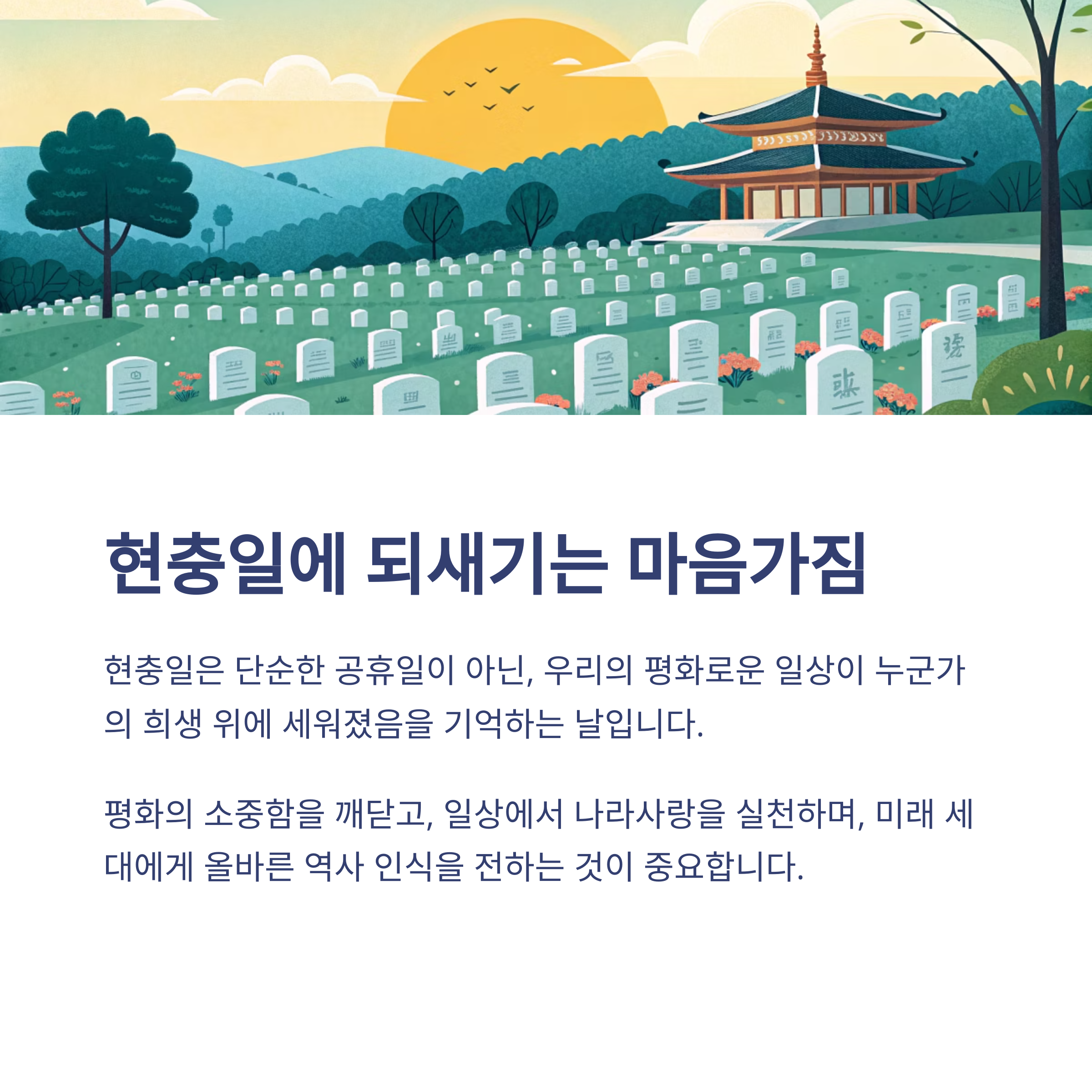 현충일은 단순히 과거를 기억하는 날이 아닙니다. 오늘날 우리가 누리는 자유와 평화가 누군가의 숭고한 희생과 헌신 위에 세워진 것임을 깨닫고, 그 희생에 감사하며 나라를 사랑하는 마음을 다시 한번 다지는 의미 있는 날입니다.