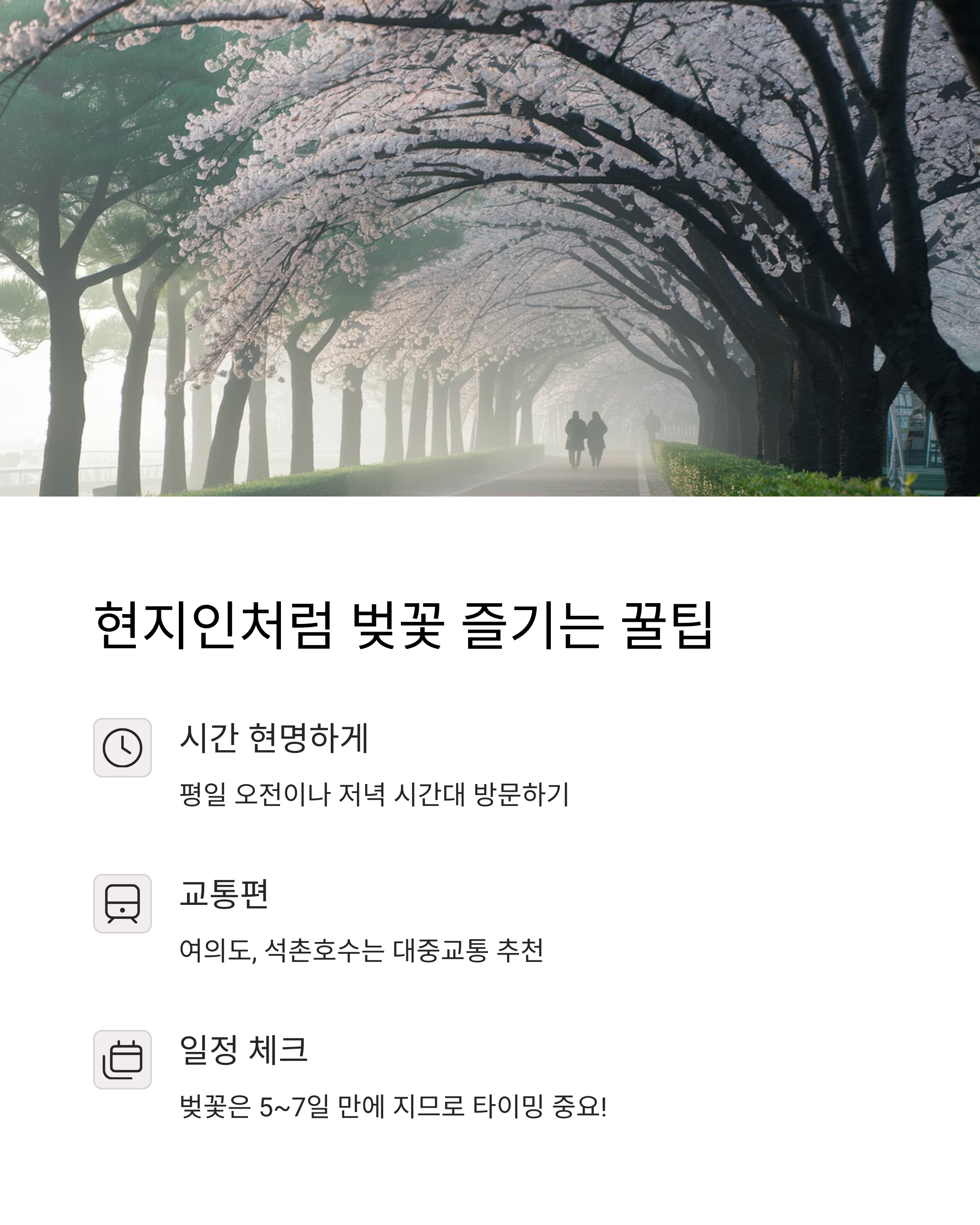 - Day 1: 여의도 벚꽃축제 (오전 일찍 방문 추천)