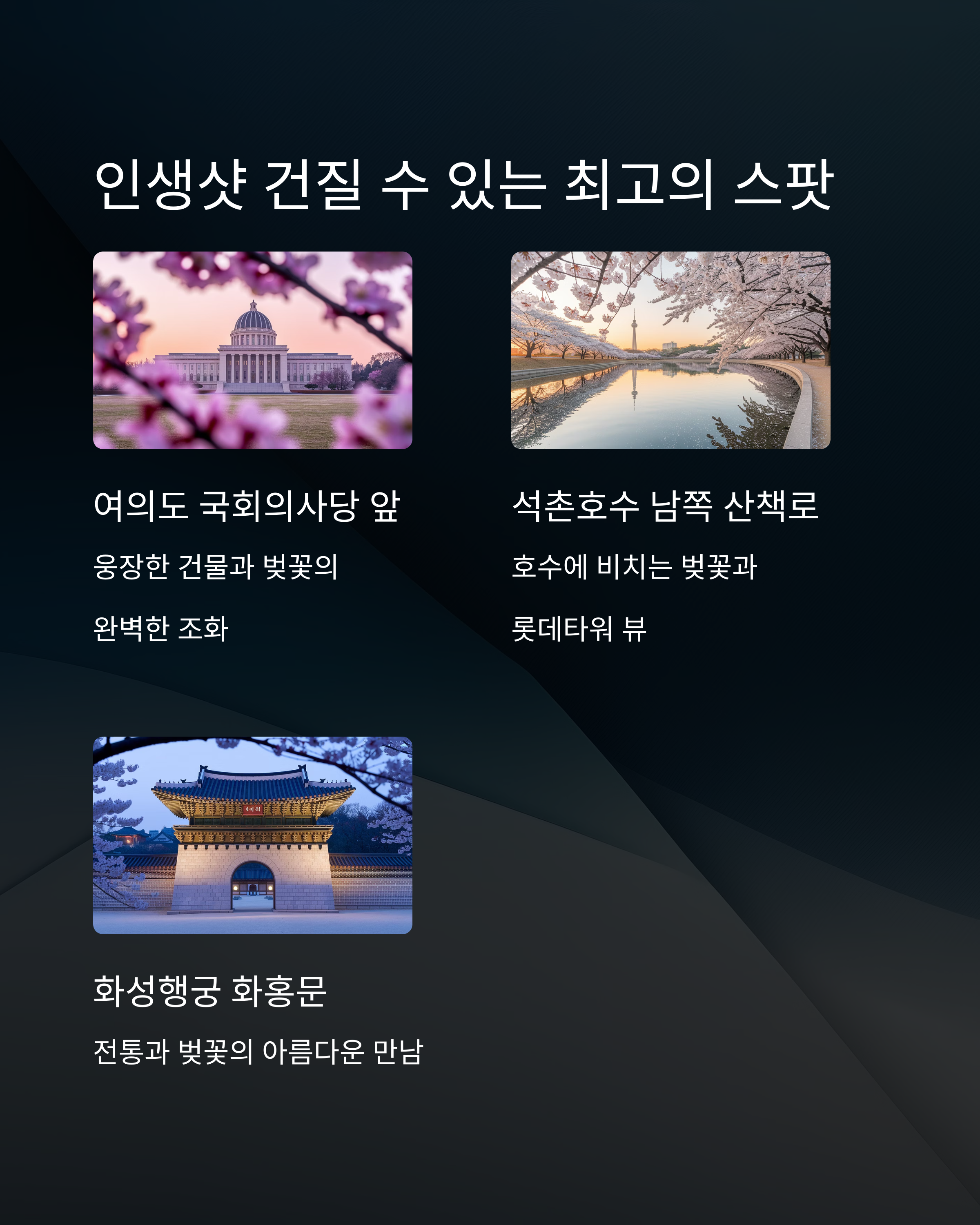 - Day 1: 수원 화성행궁 벚꽃길 (개화 초기의 청순한 분위기)