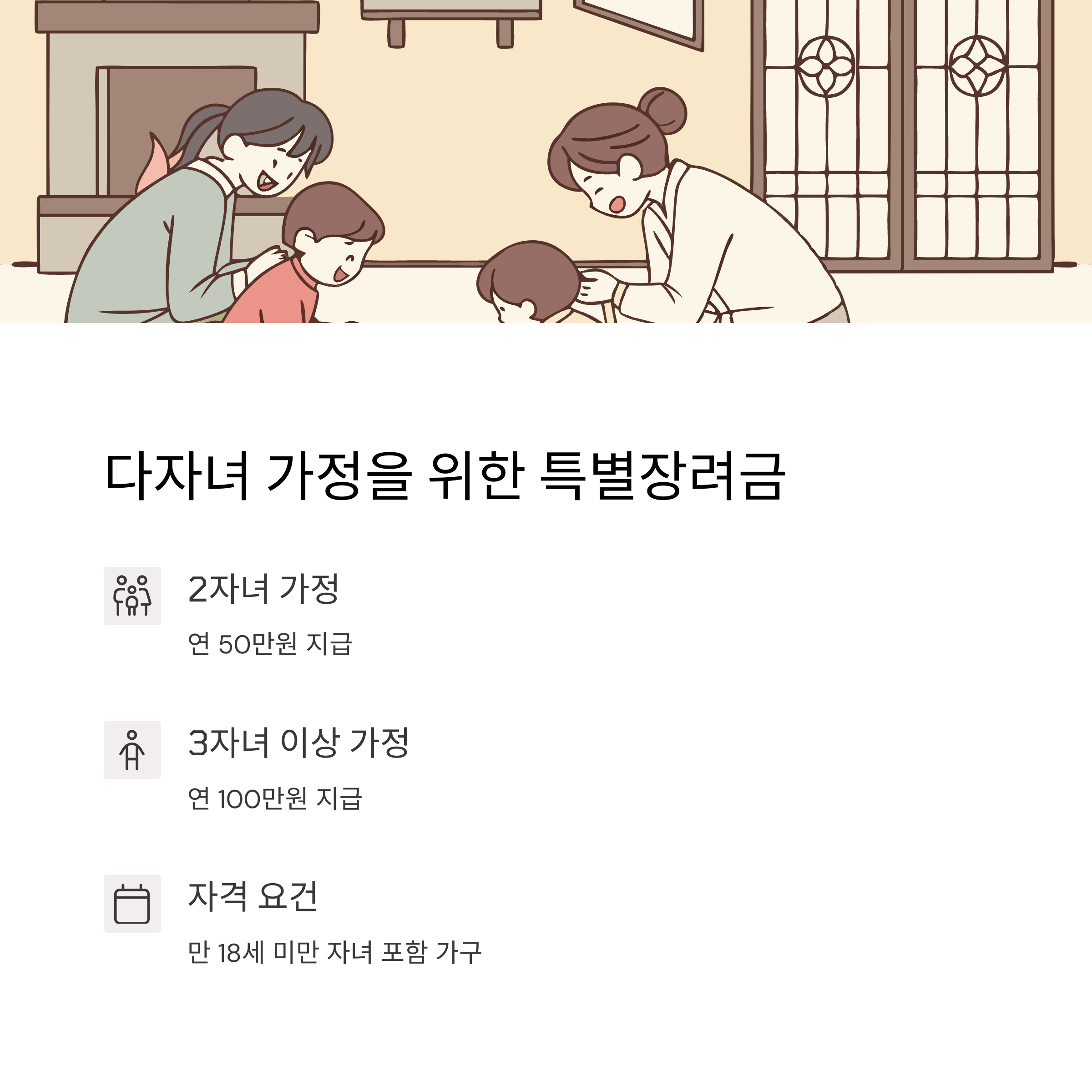 - 지원 금액: 자녀 2명 가정 연간 50만원, 3명 이상 가정 연간 100만원