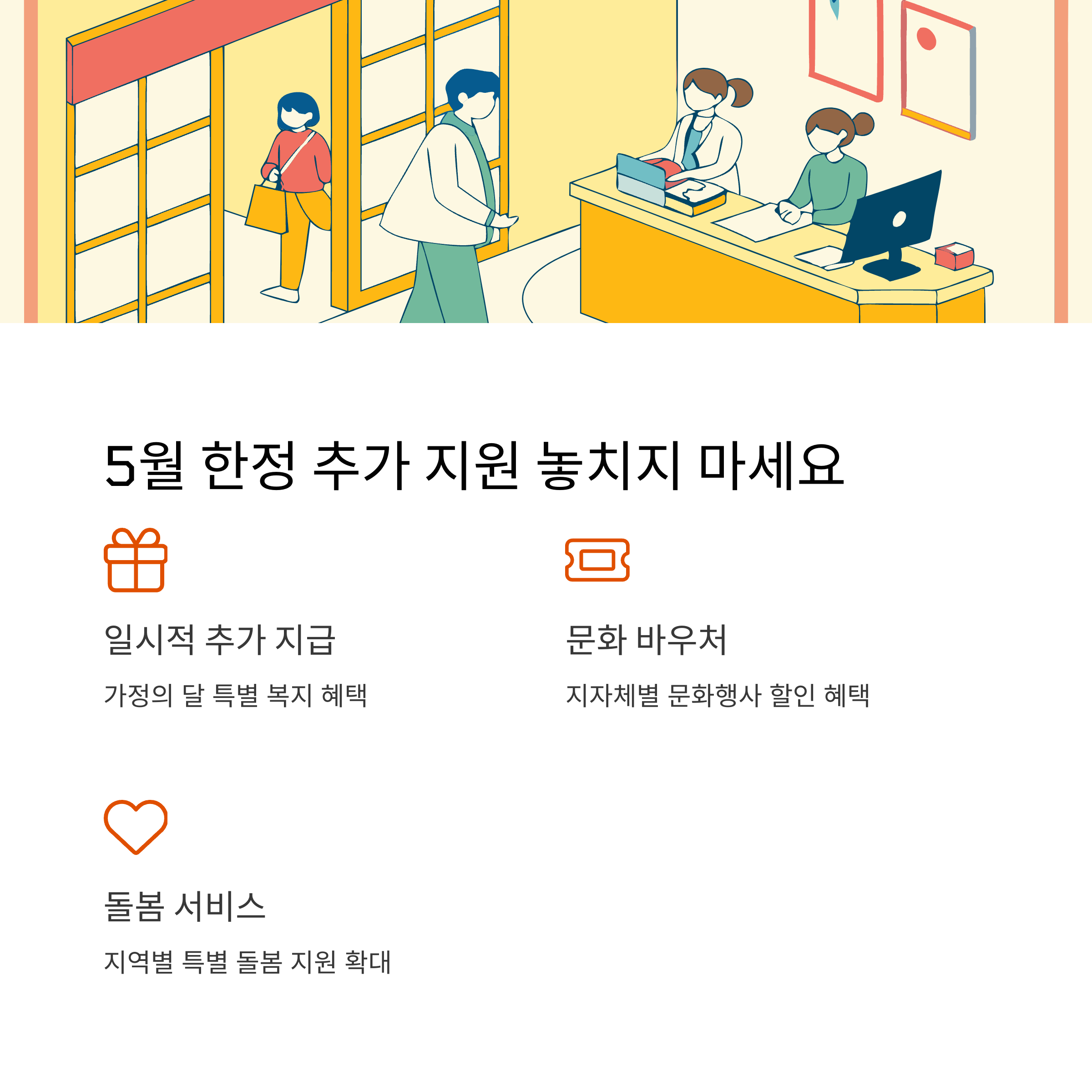 - 5월 특별지원: 가정의 달 기념 문화 바우처 제공 (가족당 10만원 상당)