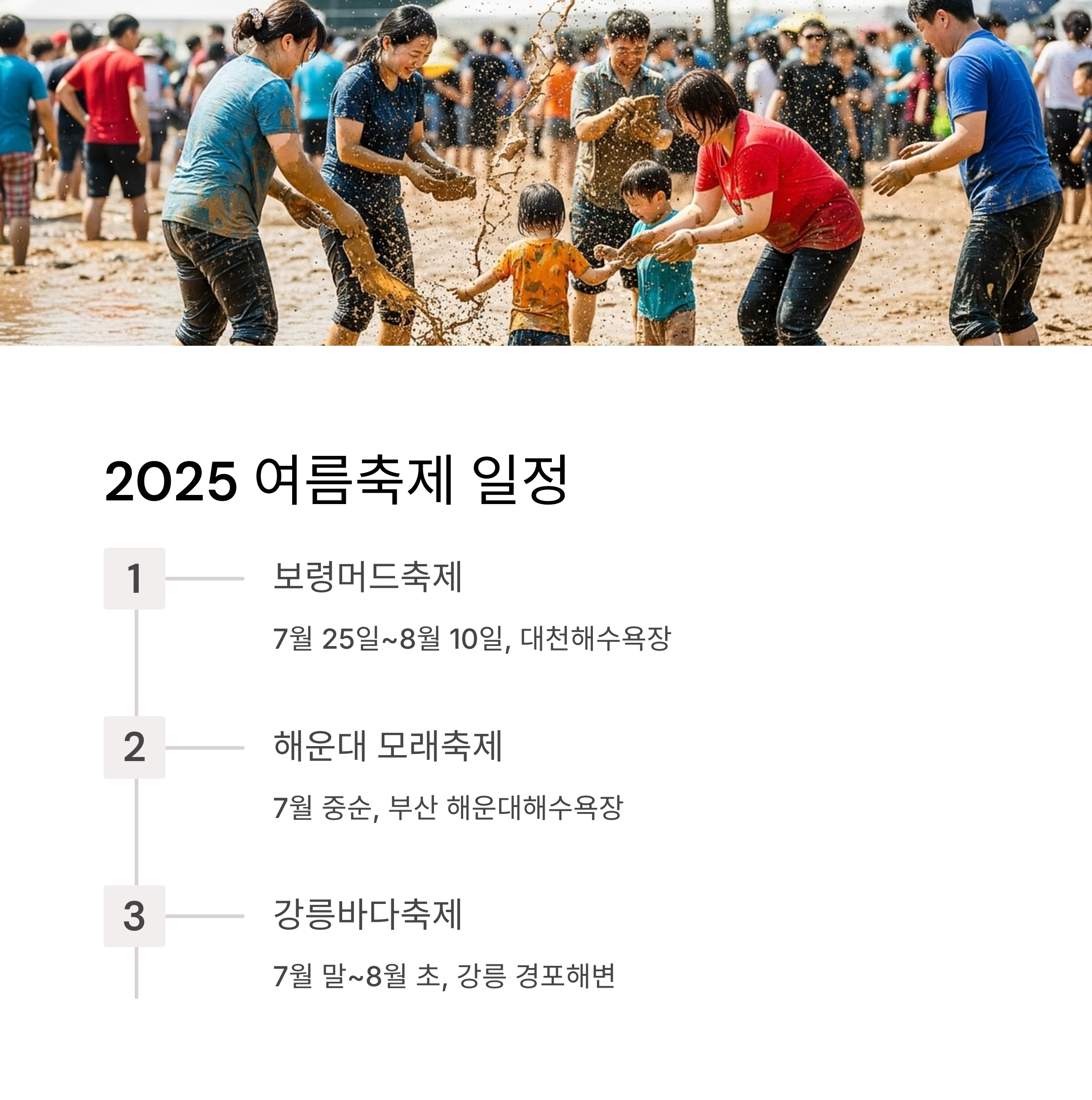 특히 올해는 보령머드축제를 비롯한 다양한 여름축제들이 코로나19 이후 본격적으로 재개되어 더욱 풍성한 여름 추억을 만들 수 있을 것으로 기대됩니다. 안전한 여행을 위해 미리 준비사항을 체크하시고, 날씨 변화에도 주의를 기울이시기 바랍니다.