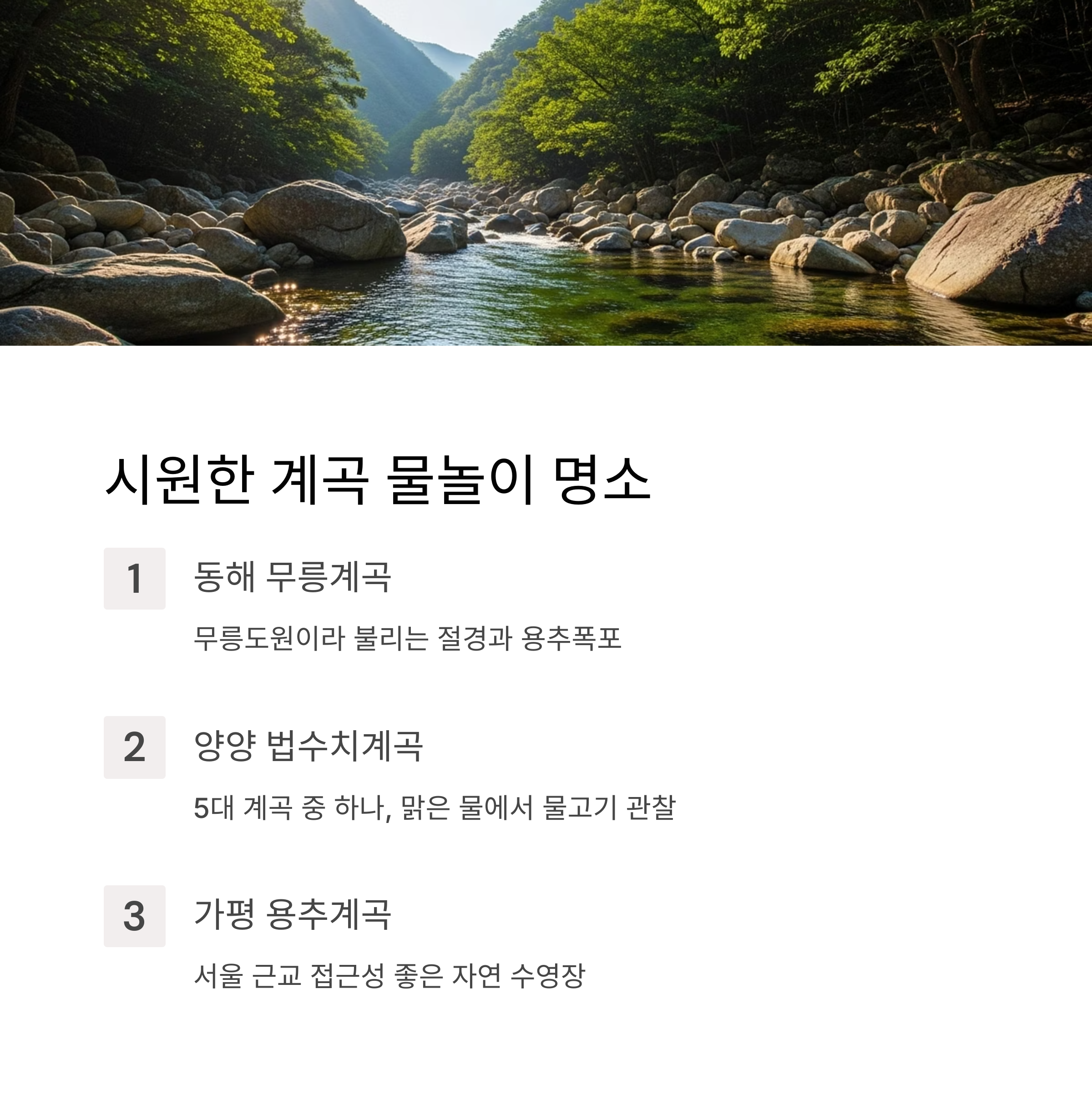 서울에서 접근성이 뛰어난 가평 용추계곡은 수도권 주민들에게 사랑받는 대표적인 피서지입니다. 용추폭포를 중심으로 형성된 자연 수영장에서 시원한 물놀이를 즐길 수 있으며, 주변 펜션과 캠핑장 시설이 잘 갖춰져 있어 당일치기나 1박 2일 여행 모두에 적합합니다.