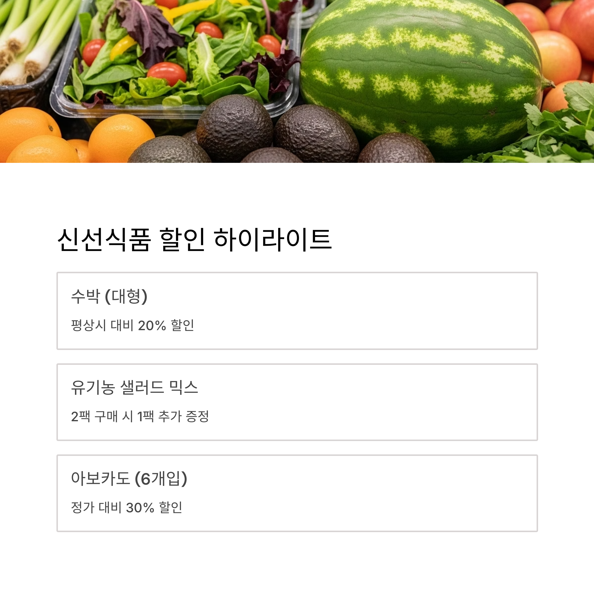 7월 넷째주 신선식품 할인의 하이라이트는 여름철 대표 과일과 채소들입니다. 특히 수박, 참외, 복숭아 등 제철 과일들이 대폭 할인되며, 샐러드용 채소류도 저렴한 가격으로 만나볼 수 있습니다. 이번 주 주요 할인 품목은 다음과 같습니다: