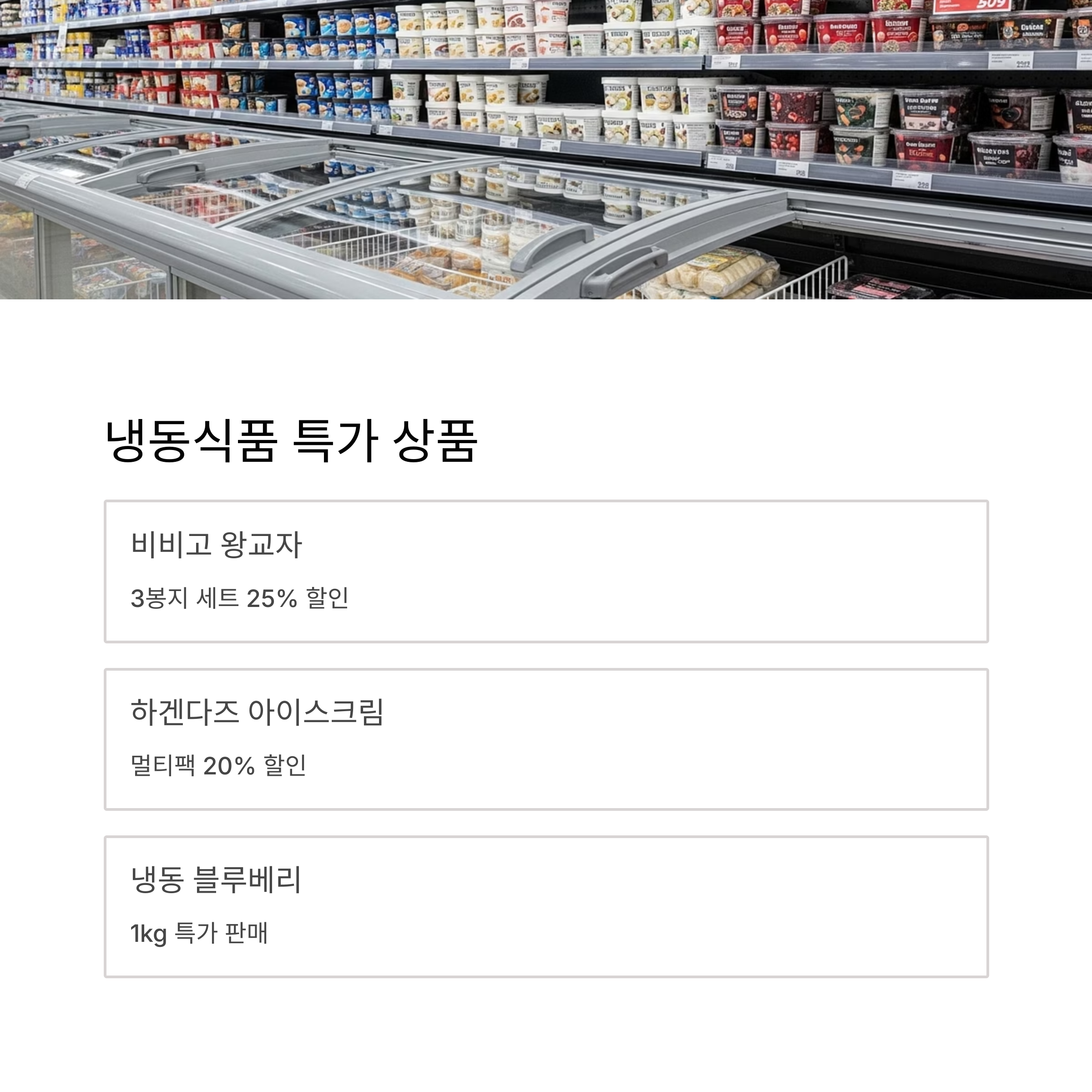 여름철 간편식으로 인기 있는 냉동식품들도 이번 주 대폭 할인됩니다. 특히 냉동 만두, 냉동 피자, 아이스크림 등이 주요 할인 대상입니다. 휴가철 간편하게 해결할 수 있는 식품들이 많아 가족 단위 구매에 적합합니다.