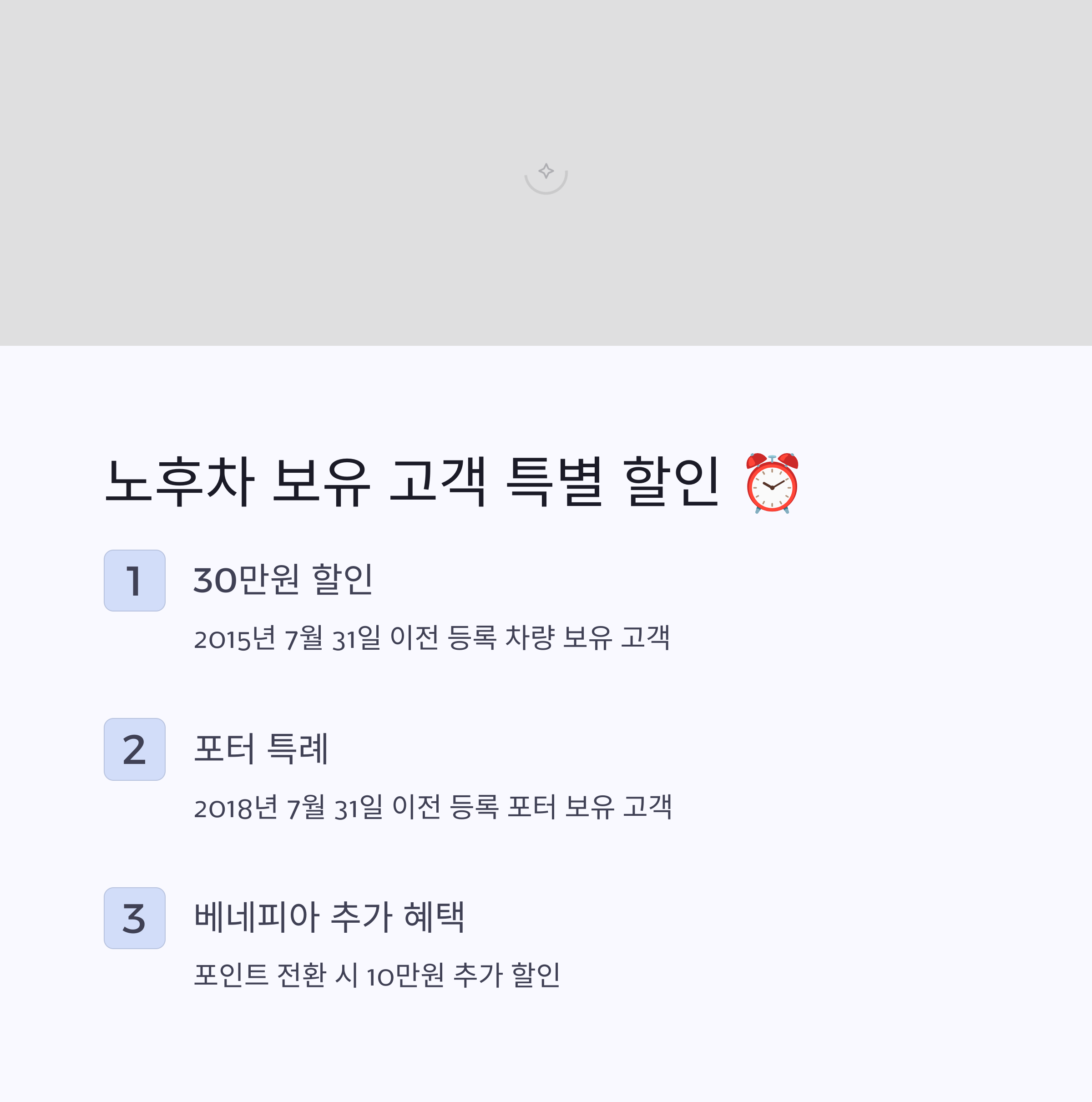 - 노후차 보유 할인: 10년 이상 보유 고객 30만원 할인