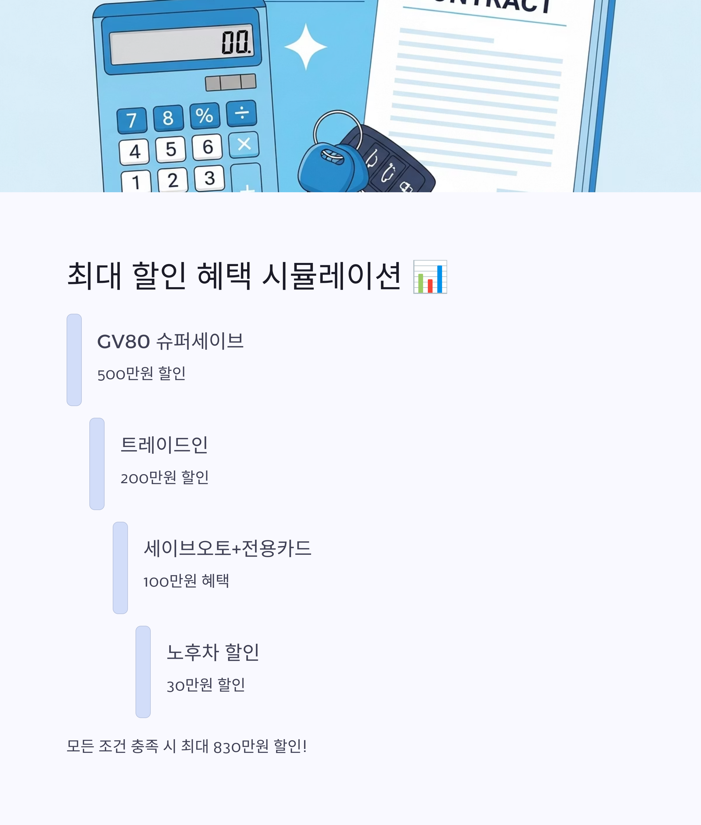 특히 GV80, GV70 슈퍼세이브 프로모션과 트레이드인 혜택을 조합하면 신차를 기존 대비 10~15% 저렴하게 구매할 수 있습니다. 단, 슈퍼세이브 재고는 한정되어 있으므로 관심 있는 고객은 빠른 상담과 결정을 권합니다.