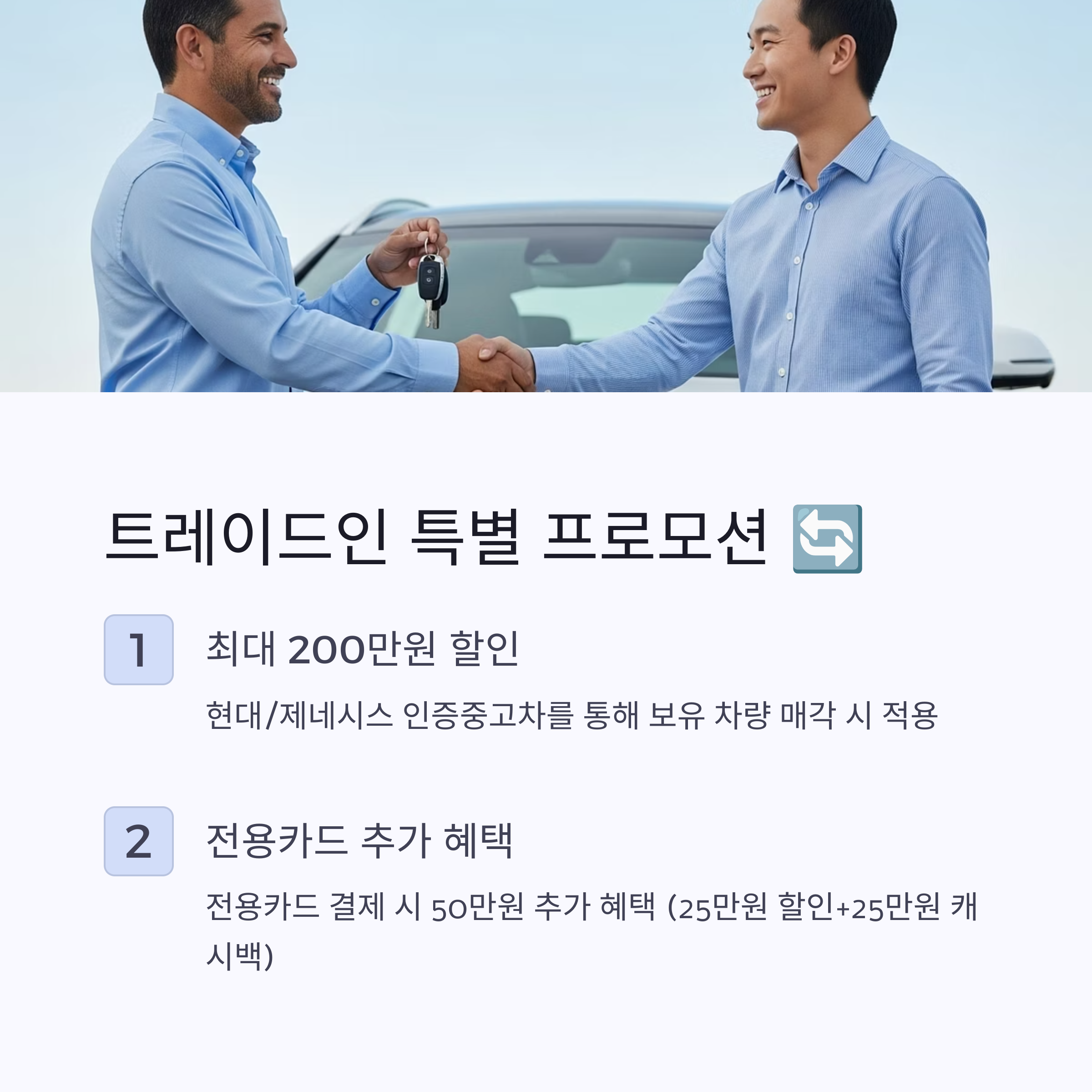 제네시스 트레이드인 프로그램은 2025년 7월 1일부터 31일까지 진행되는 대표적인 혜택 중 하나입니다. 현대/제네시스 인증중고차를 통해 보유 차량을 매각하고 제네시스 신차를 구매하는 고객에게 200만원의 할인을 제공합니다.