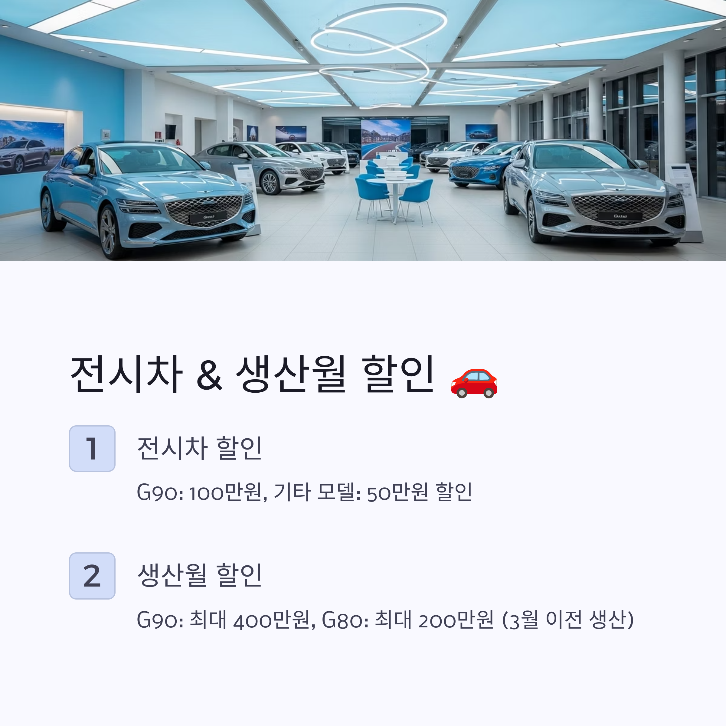 제네시스 전시차 할인은 전시장에서 고객 상담 및 시승용으로 사용된 차량에 대해 제공되는 특별 할인 혜택입니다. 2025년 7월 현재 전시차 할인 혜택은 차종에 따라 차등 적용되고 있습니다.